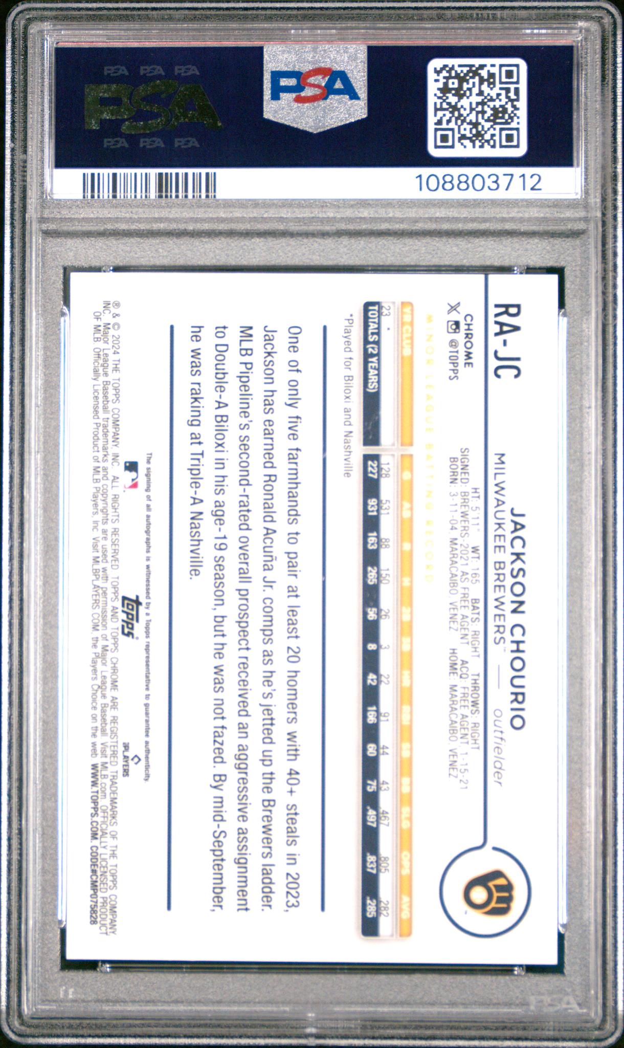 Feast your eyes on this magnificent piece of sports memorabilia! I am proud to present this 2024 Topps Chrome RA-JC Jackson Chourio rookie card, a true gem in the world of baseball card collecting. Manufactured by Topps, a brand synonymous with quality and authenticity, this card is a standout.