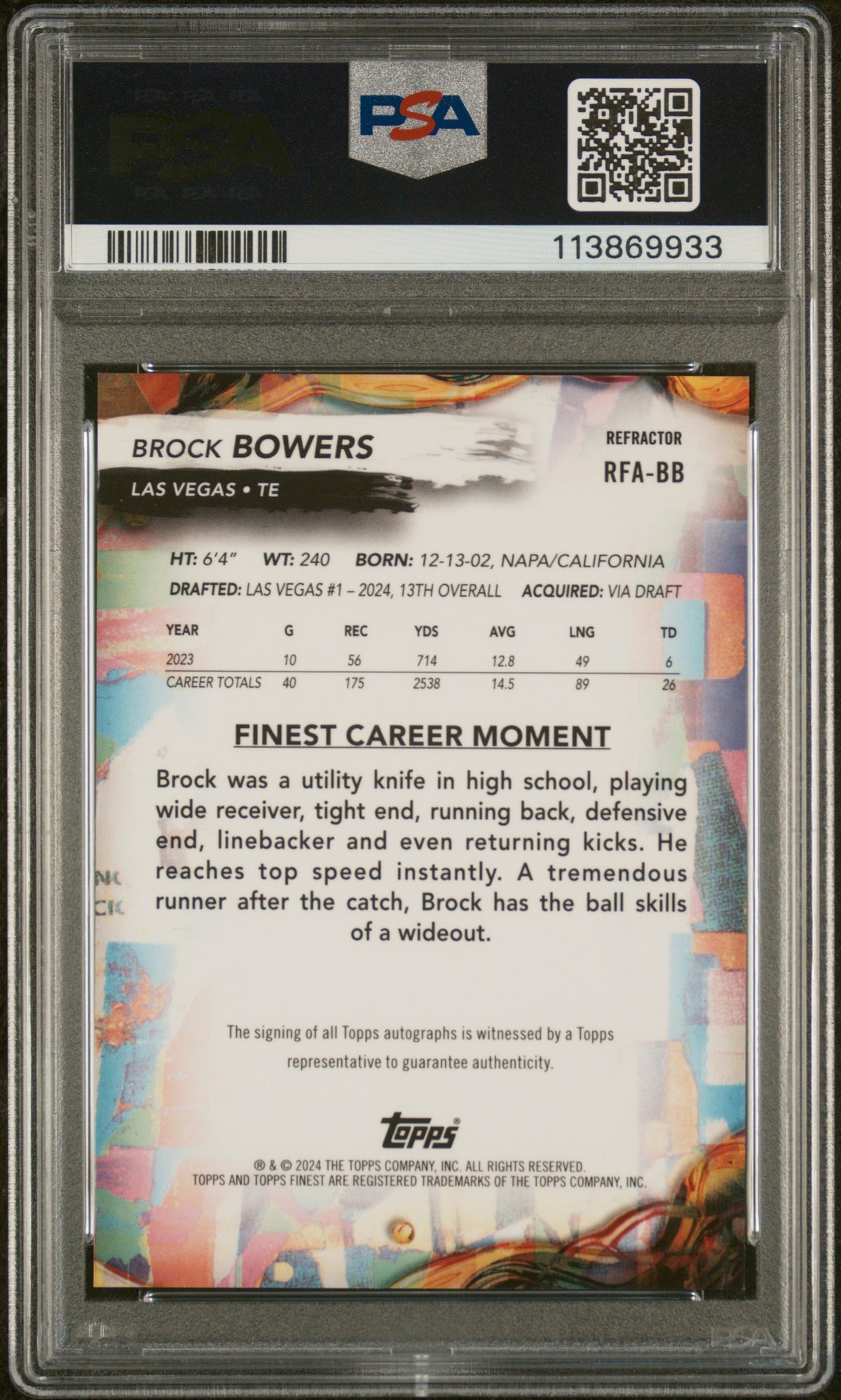 2024 Topps Finest Rookie Finest Refractor Brock Bowers #RFA-BB RC Auto PSA 10