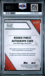 Feast your eyes on this extraordinary, 2024 Topps Finest RFA-MP Michael Page rookie card! A unique find for any UFC enthusiast or card collector, this stunning piece stands out with its autographed feature, personally signed by the notable Michael Page himself. The card is part of the esteemed 'Finest Rookies' insert set, marking it as a highly desirable addition to any collection.