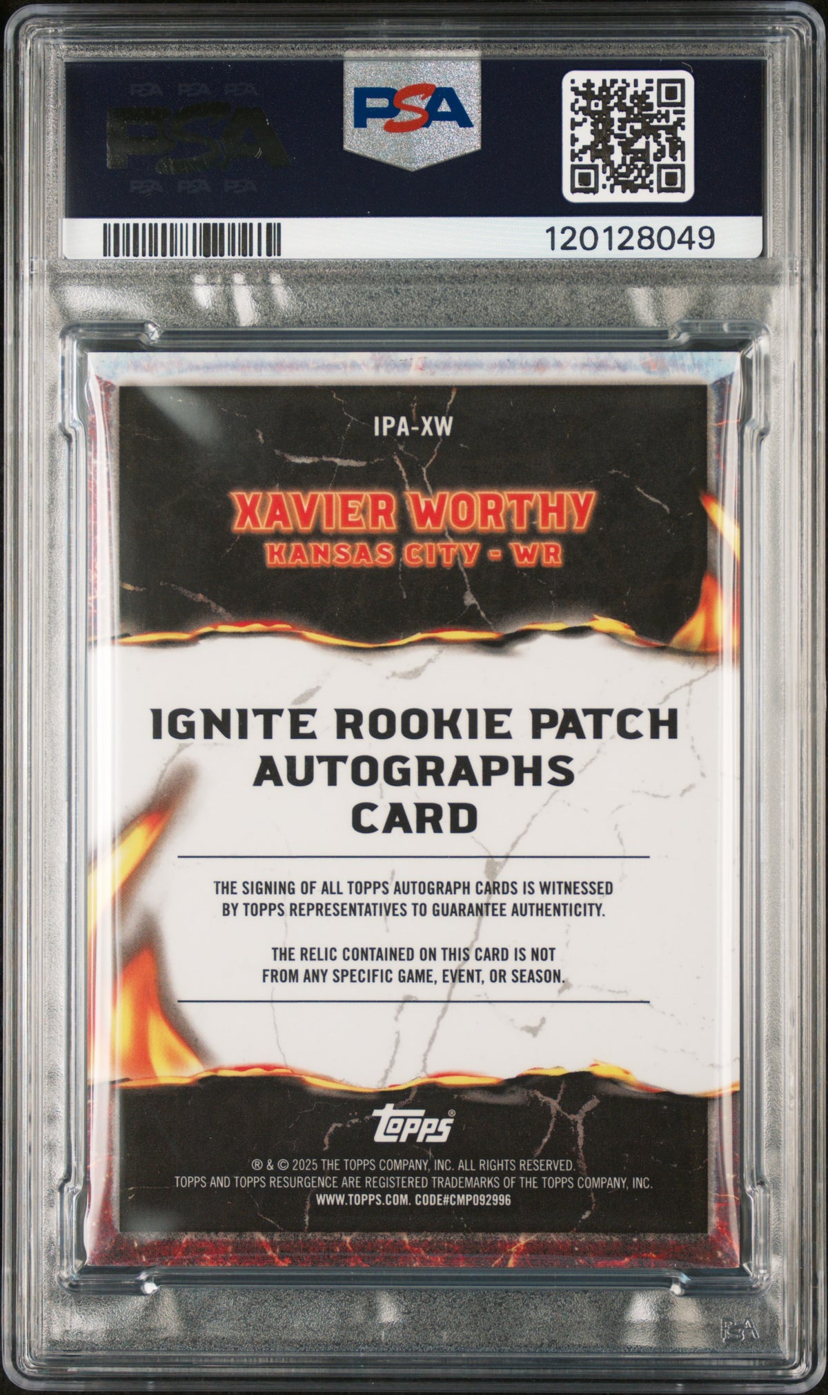 The card showcases Xavier Worthy, a rising star from the Kansas City team. His dynamic playstyle and relentless determination are brilliantly captured, making this card a true testament to his talent. Not just a visual delight, this card is autographed by Worthy himself, enhancing its value and appeal to any collector or fan.