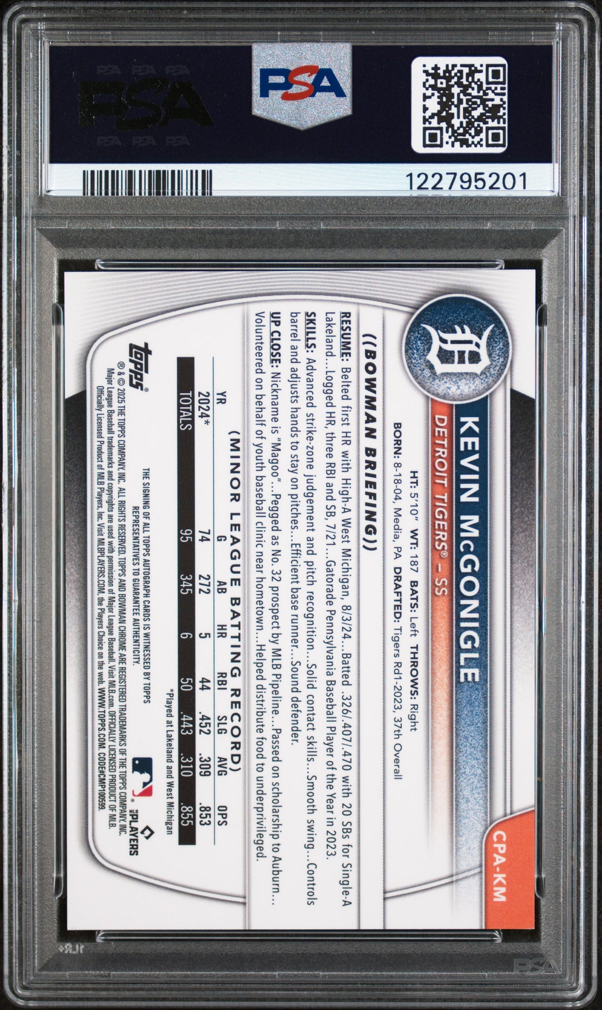 This card does not only offer you a piece of baseball history but also an artwork worthy of admiration. Add this 2025 Bowman CPAKM Kevin McGonigle to your collection today, and own a piece of this Detroit Tiger's legacy. This card is a gem that shines brightly among other baseball cards, and an investment that could grow in value over time. Enjoy the thrill of possessing this card, as you continue to celebrate your love for the grand sport of baseball.