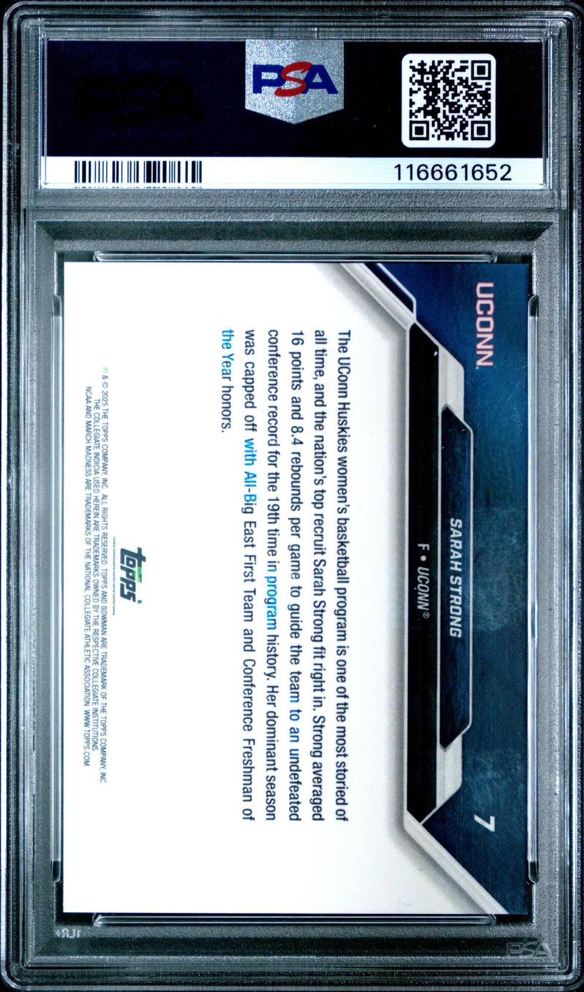 Capturing Sarah Strong in her rookie year, this card is a splendid memento from her time at UCONN in NCAA. The card is not autographed, maintaining the pristine nature of this collectible. Its serial number and parallel details are not applicable, emphasizing its unique status in the sports card realm.