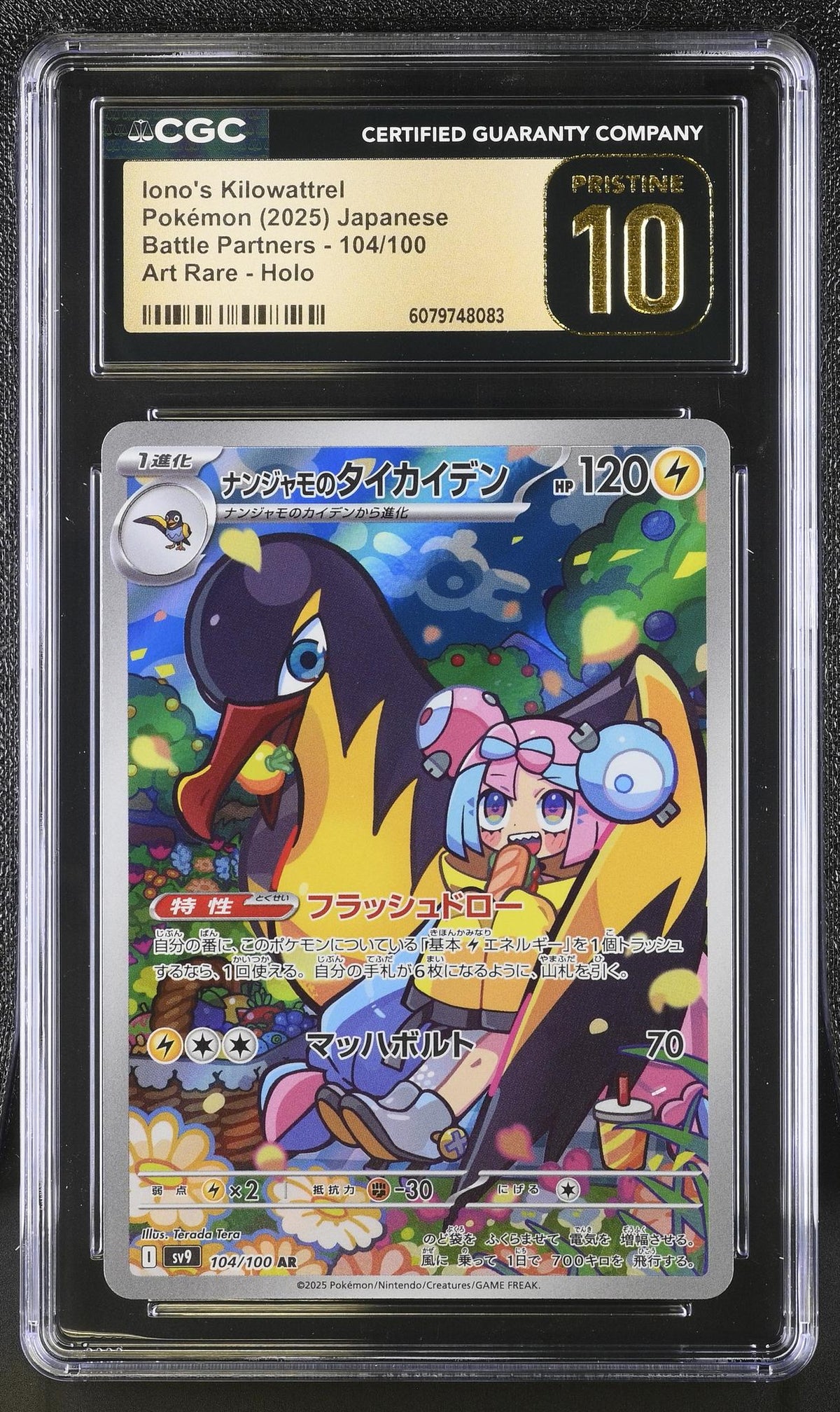 Immerse yourself in the world of Pokemon with the highly sought-after "Iono's Kilowattrel" card from the distinguished Battle Partners set. Published in 2025, this gem is not just any card, but a stunning 'Art Rare' collectible that has been professionally graded by CGC with a perfect score of 10, confirming its Pristine condition.