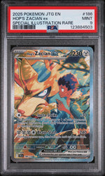 Behold the magnificence of the 2025 Pokemon JTG #186 Zacian, a gem for both the avid Pokemon collector and fans of the illustrious Zacian character. This card hails from the coveted 'Special Illustration Rare' insert set, a collection highly sought after by enthusiasts worldwide. The card flaunts an exceptional PSA grading of Mint 9, attesting to its pristine condition and superior preservation.
