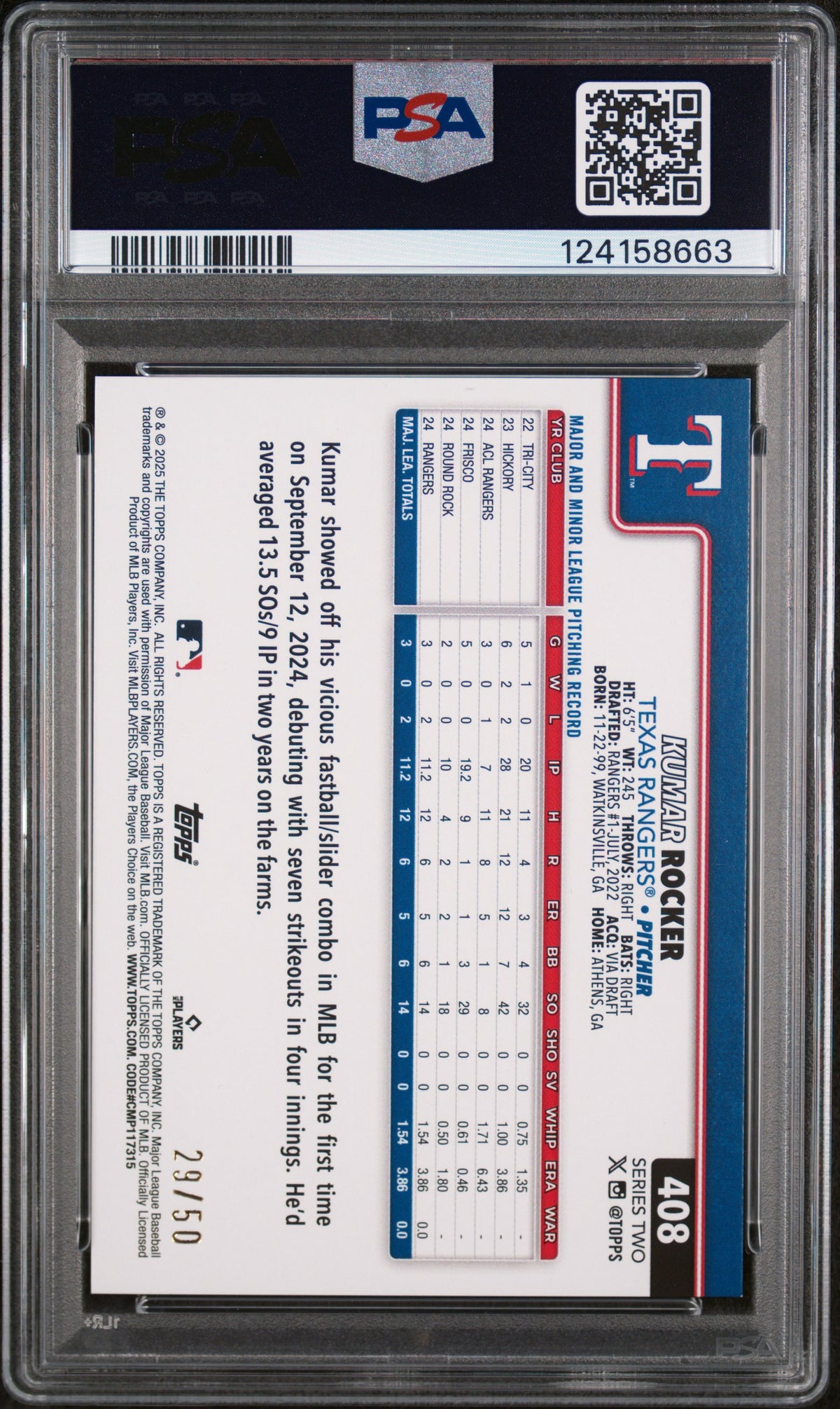 This card doesn't just include memorabilia, it is one. A tangible piece of sports history that you can hold in your hands. Don't miss your chance to own this remarkable piece of MLB memorabilia. Secure your 2025 Topps 408 Kumar Rocker Gold Holo Foil rookie card today!