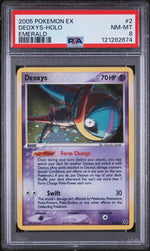 Dive into the fascinating world of Pokemon with this stunning 2005 Deoxys card from the EX series. This card is a stellar addition to any collection, boasting a holographic finish that brings the charismatic character Deoxys to life. Graded an impressive PSA 8, this card is in Near Mint to Mint (NM-MT) condition, testament to its top-notch quality and preservation.