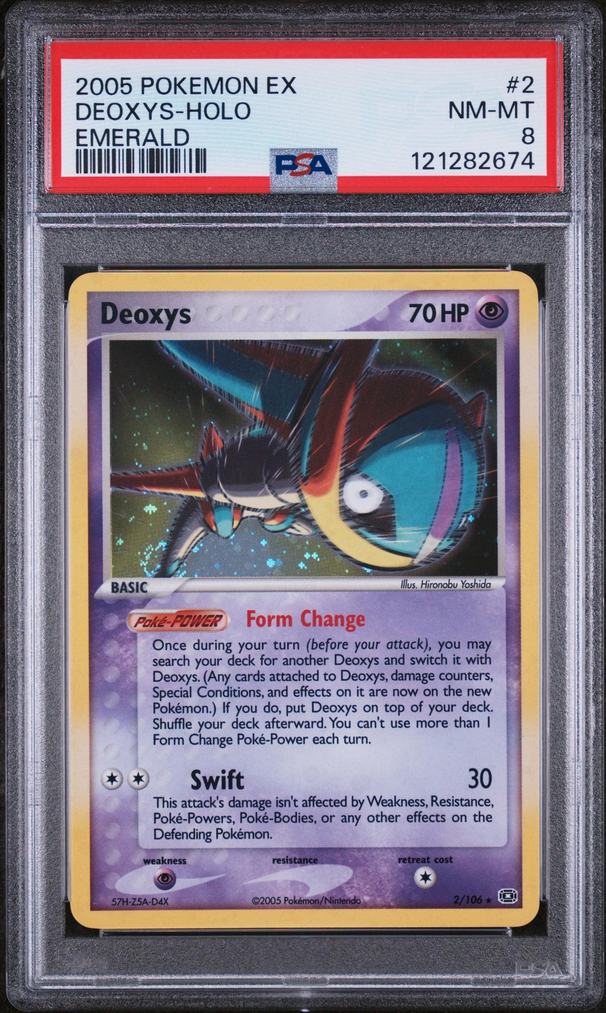 In summary, this 2005 EX #2 Deoxys PSA 8 card is a fantastic piece of Pokemon memorabilia, perfect for both seasoned collectors and those just starting on their Pokemon journey. Its superior condition, attractive design, and beloved character make it a must-have addition to any collection.
