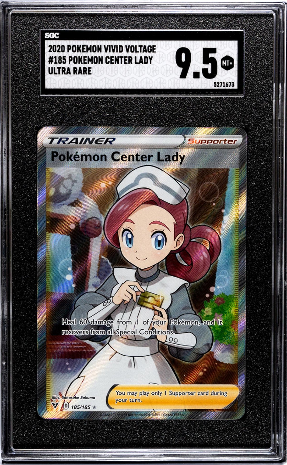 Feast your eyes on this extraordinary find - a 2020 Pokemon Vivid Voltage Ultra Rare card featuring the beloved character, the Pokemon Center Lady. This card, manufactured by Nintendo, is a must-have for any dedicated Pokemon card collector. The card stands out not just for its rarity, but also for its exceptional quality. It is professionally graded by the reputable SGC, boasting a near-pristine grade of 9.5 and described as Mint+ condition.