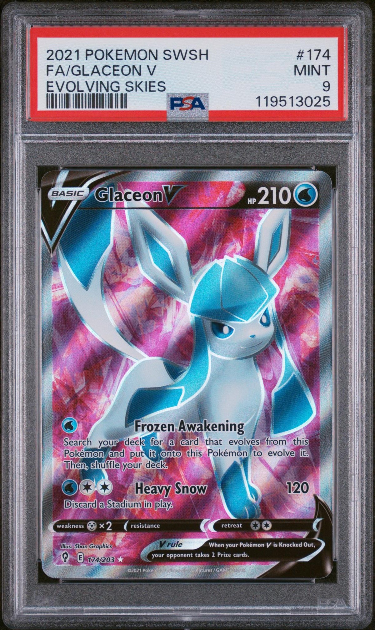 This card's rarity and its mesmerizing design, coupled with its high-grade condition, make it a prized find for any collector. Whether you're looking to complete your Evolving Skies set, find the perfect gift for a Pokemon enthusiast, or simply want to own a piece of Pokemon history, the 2021 Glaceon V #174 card is a perfect choice.