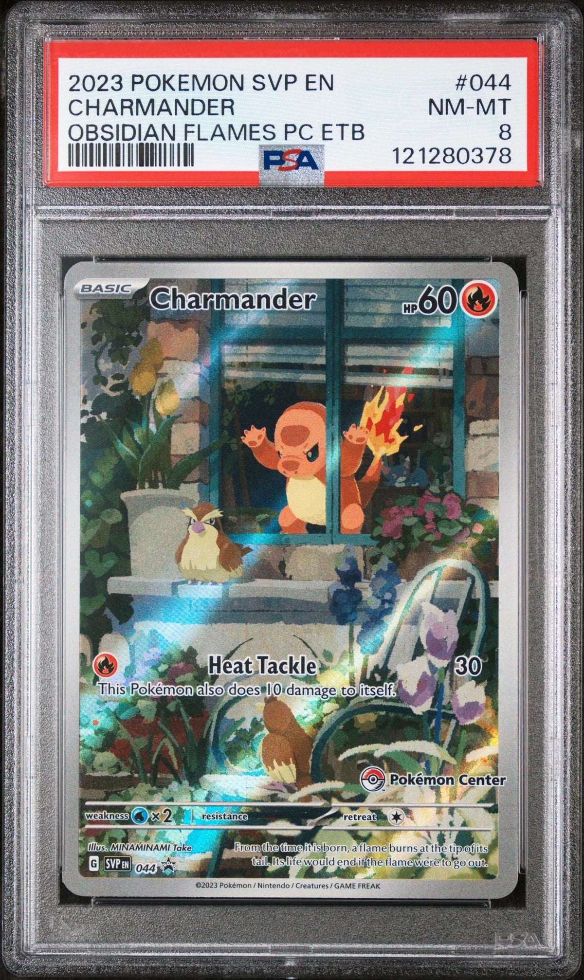 Immerse yourself in the world of Pokemon with this stunning 2023 Charmander card, manufactured by the renowned Pokemon Company. This card is not just an item, it's a prized possession, a gem from the exclusive 'Obsidian Flames PC ETB' set that any collector would be thrilled to own.