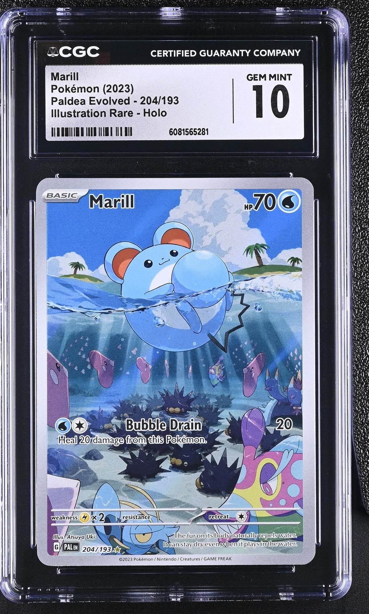 While this Marill card isn't a rookie, its high grade and rarity make it a sought-after piece. Its key features include the Illustration Rare status, the Holo finish, the Gem Mint 10 grading, the inclusion in the 2023 Paldea Evolved set, and the Marill character.