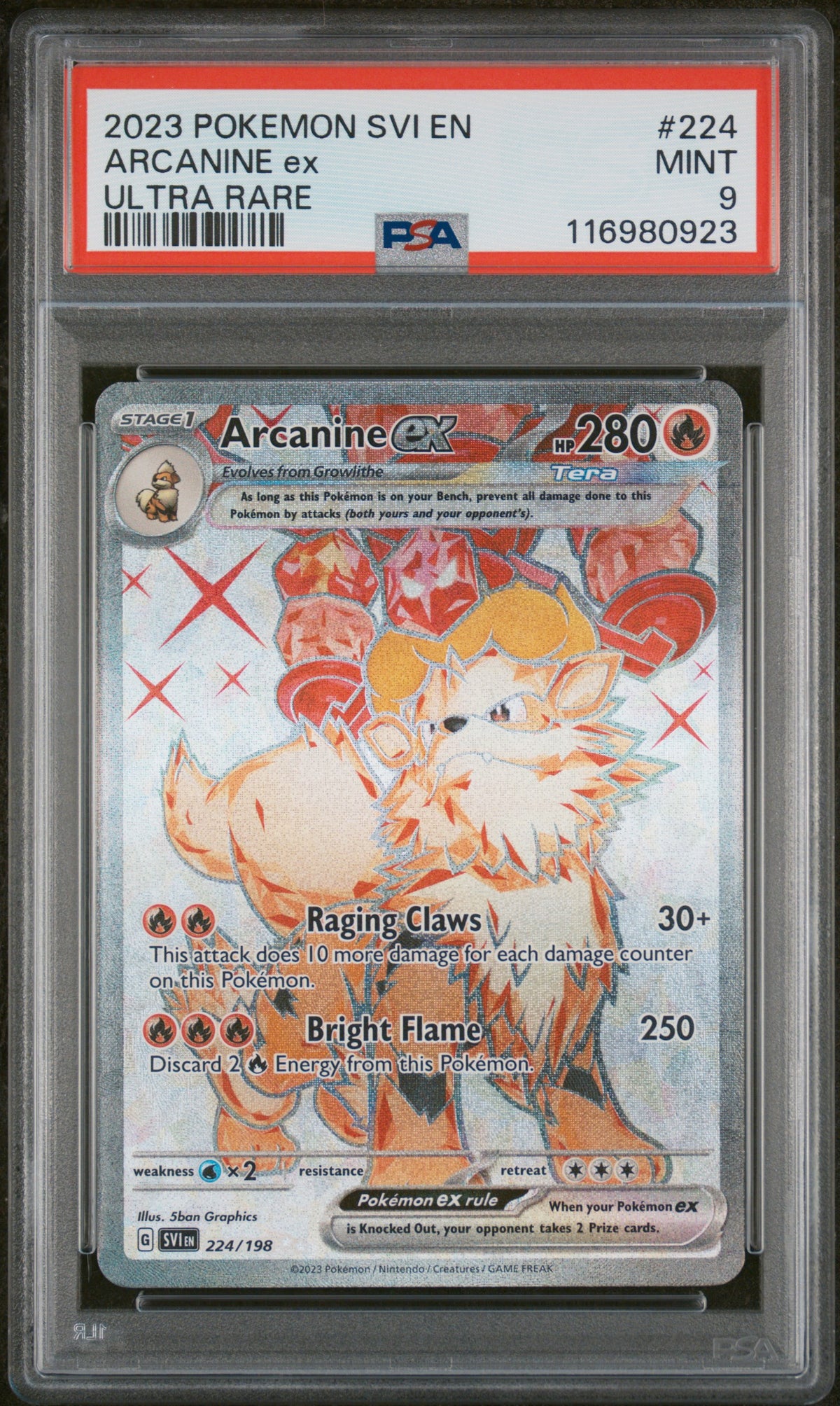 The card's key features are its ultra-rare status, the 2023 release, its mint condition, its PSA grading, and its belonging to the 'Scarlet & Violet' set. Nothing can quite compare to the joy of owning this Arcanine ex card, a symbol of the captivating and adventurous world of Pokemon. Don't miss the opportunity to add this card to your collection!
