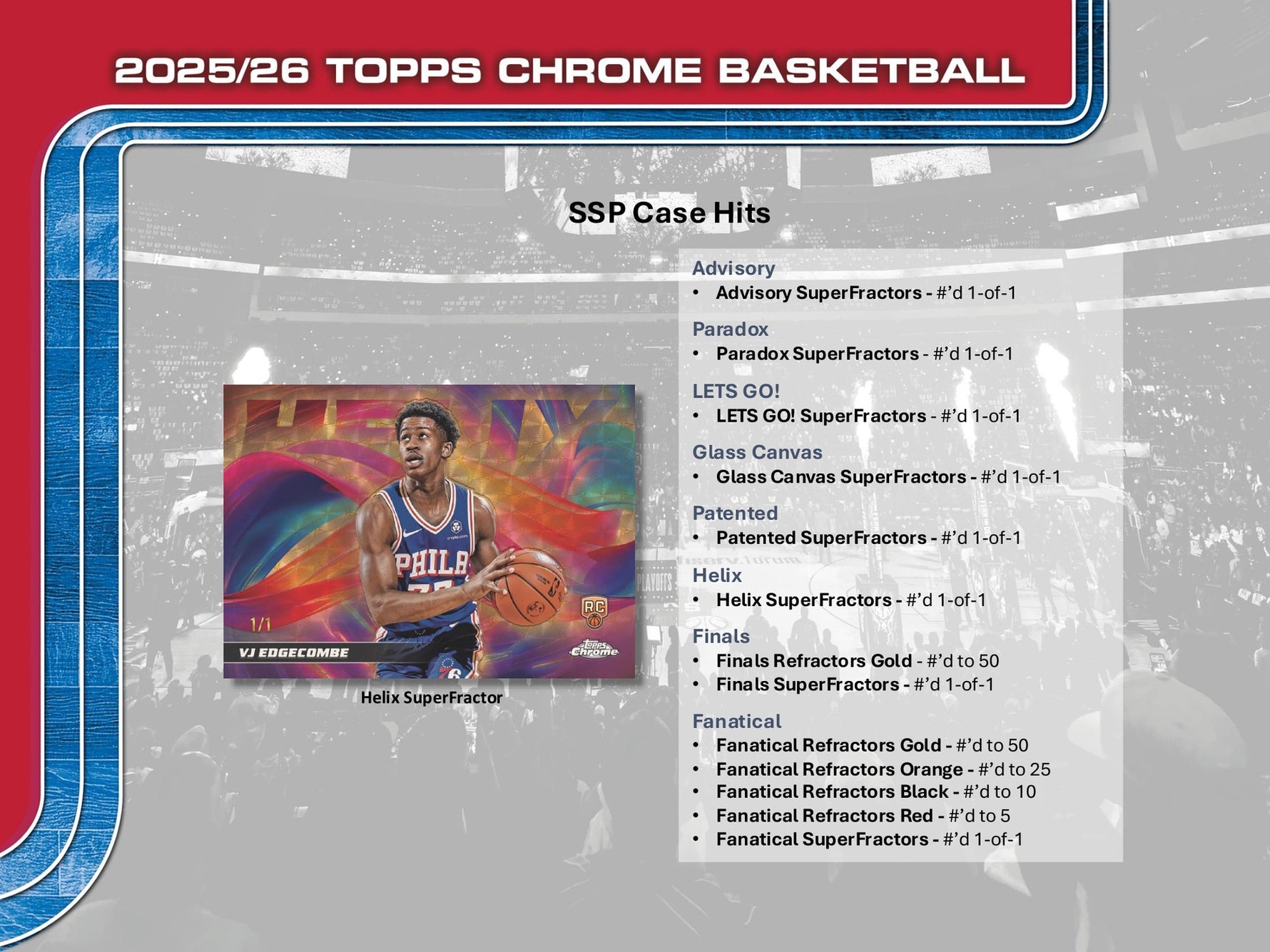Chase a wide range of Chrome parallels including Pulsar, RayWave, Skylight, X-Fractors, Basketball, FrozenFractors, and Superfractors