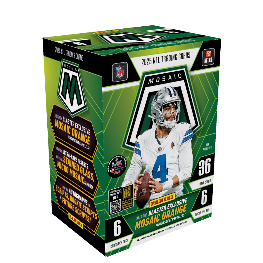 The 2025 Panini Mosaic Football Blaster Box delivers one of the hobby’s most popular chromium-style football releases in an exciting retail format. Produced by Panini America, Mosaic Football is known for its vibrant parallels, bold inserts, and deep checklist featuring top NFL rookies, current stars, and legendary players.