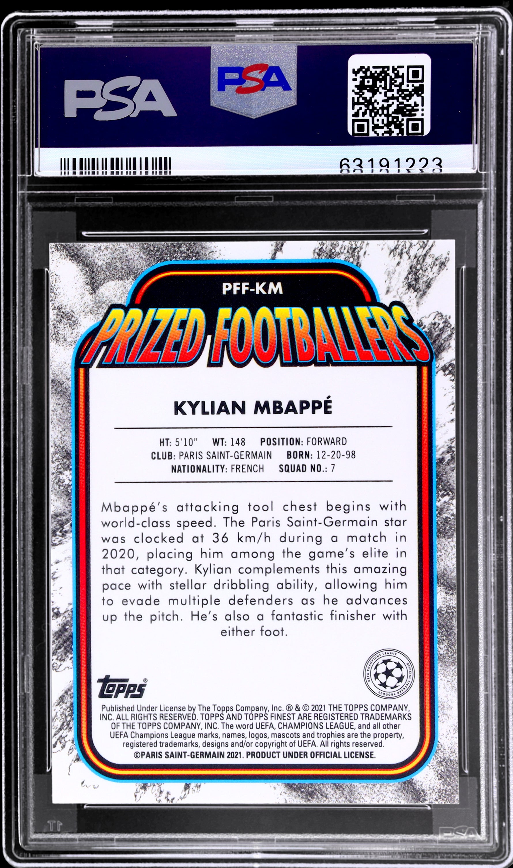 This 2020 Topps Finest Prized Footballers Black/Gold Fusion Kylian Mbappe PSA 10 card is more than just a collectible - it's a tangible piece of sports history, a testament to the electrifying talent of Kylian Mbappe, and a symbol of the excitement and passion that football brings to millions. Don't miss the opportunity to make it yours!