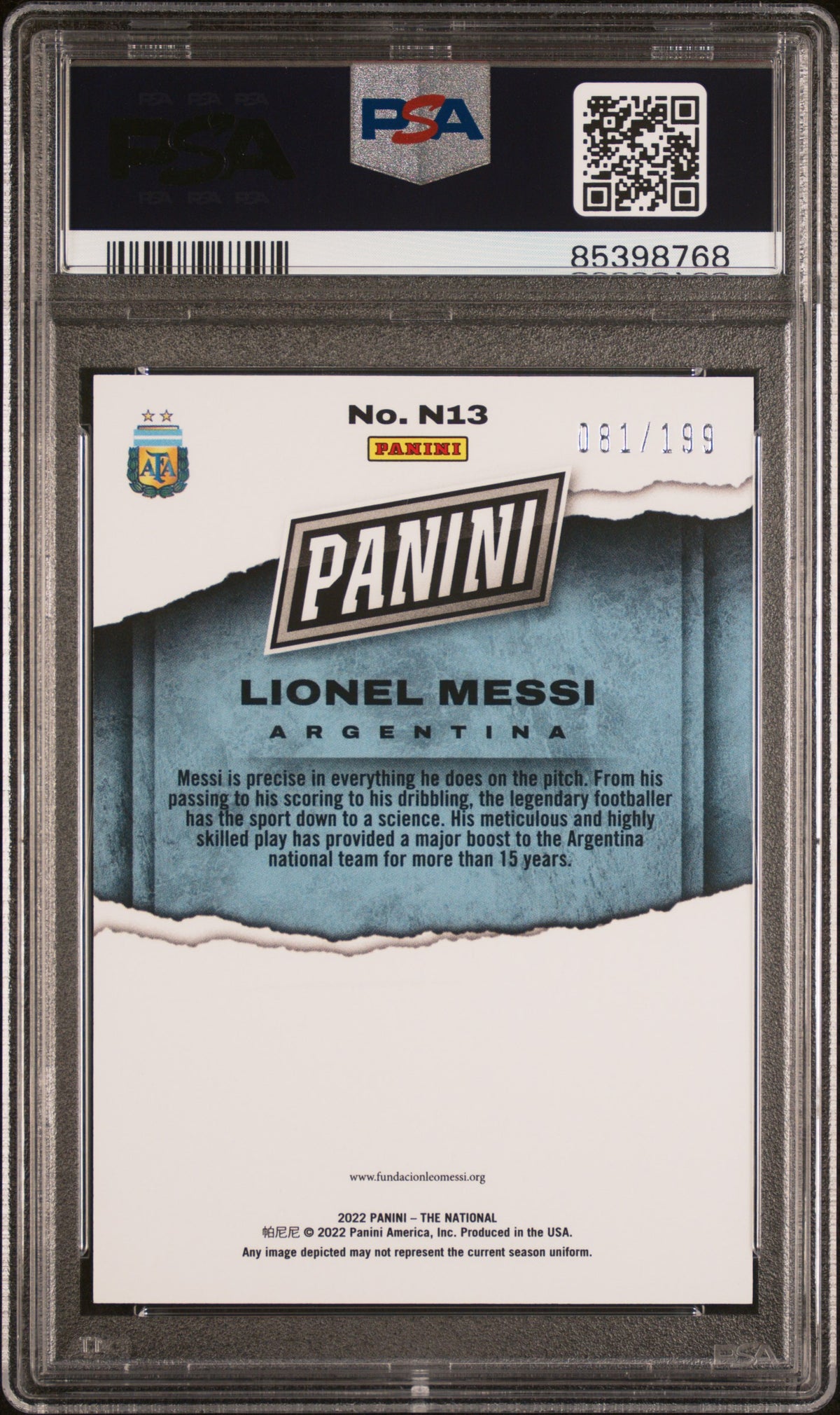 Behold the magnificent 2022 Panini National N13 Lionel Messi soccer card! This stunning piece showcases the legendary Lionel Messi, Argentina's very own soccer maestro, in his prime. Manufactured by the highly esteemed Panini, this card hails from the exquisite 'Panini National' brand, known for its exceptional quality and unparalleled craftsmanship. The card is a part of the coveted 'Insert-Orange' set, marking it as a unique gem in any collection. Adding to its allure, it is a rare 'Orange' parallel, a feature that further elevates its value and visual appeal. What's more, it bears a unique serial number 081/199, which not only adds a layer of authenticity but also signifies that this card is part of a limited edition run. While this card doesn't come autographed, it doesn't diminish the fact that it's a shining testament to Messi's illustrious career. It has undergone professional grading by PSA, a respected authority in the field, and has proudly achieved a Gem Mint '10' grade. This pristine condition is a testament to the card's impeccable preservation and the quality of Panini's production. This 2022 Panini National N13 Lionel Messi card doesn't include any player memorabilia, but what it does offer is a tangible piece of soccer history. It's a must-have for any serious Lionel Messi fan, soccer enthusiast, or sports card collector. So, why wait? This card encapsulates the magic of Messi's skills and the thrill of the beautiful game, making it an ideal addition to your collection. Get it now and own a piece of the Messi legacy!