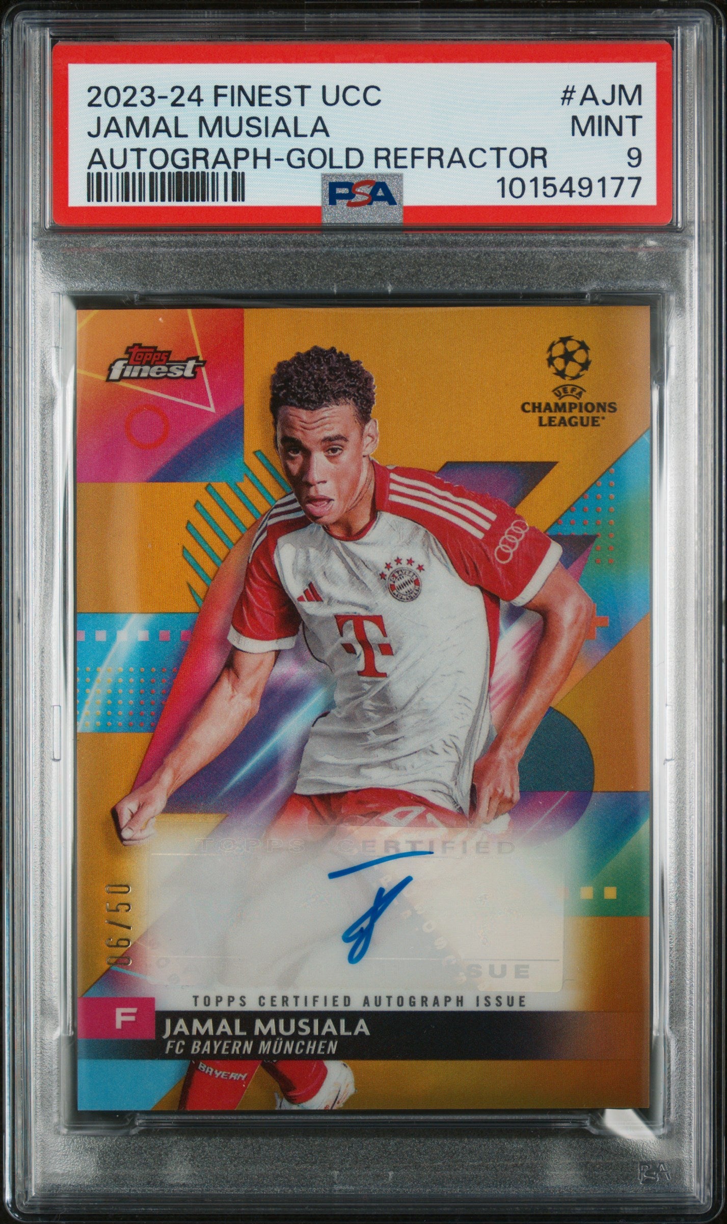 The card is a part of the Topps Finest UCL & UEL 2023/24 set, an iconic collection that every soccer card enthusiast would love to own. The key features of this card include the autograph, the Gold Refractor finish, the Mint 9 grading, and its limited edition status as 06/50.