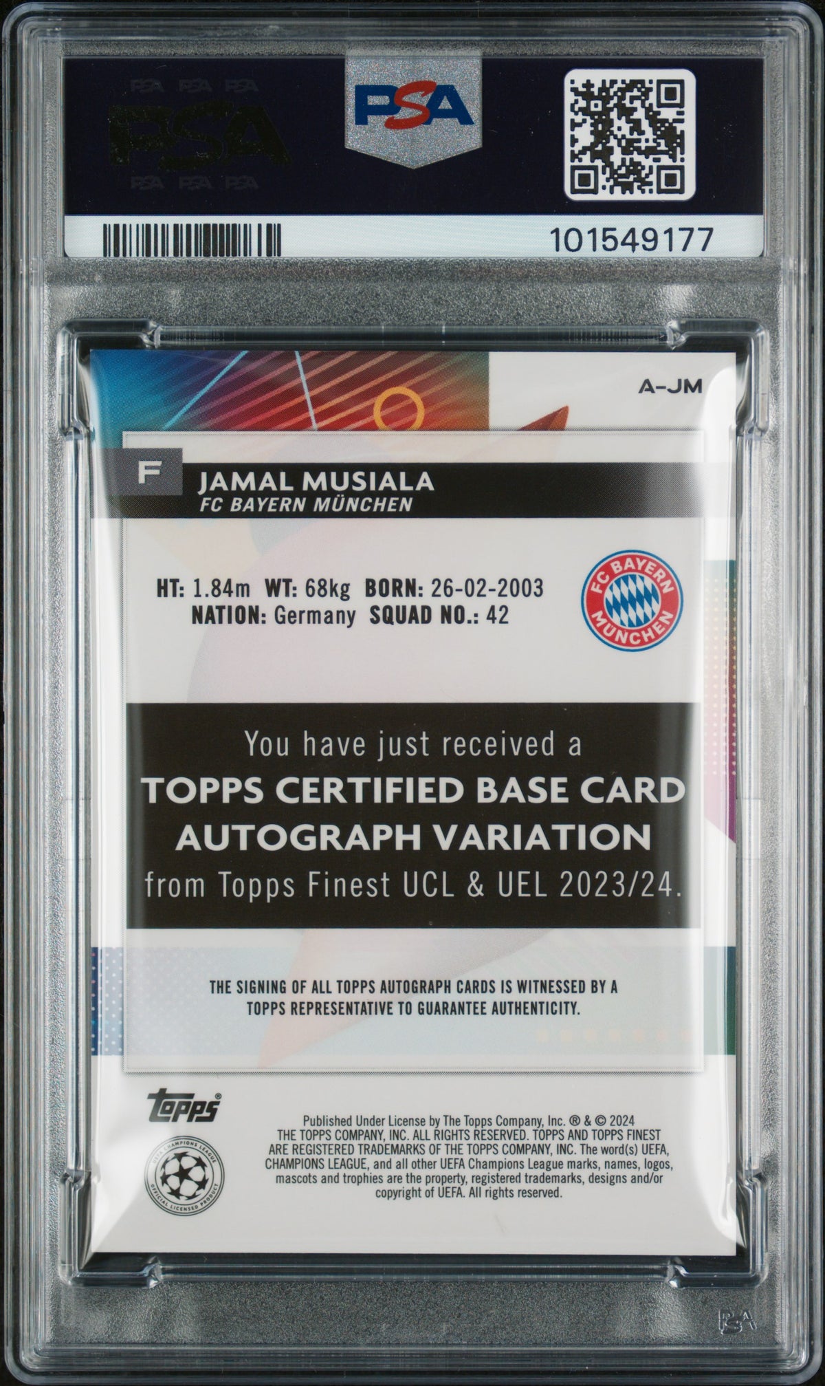What makes this card truly special is the authentic autograph of Jamal Musiala himself. Musiala, a standout player for FC Bayern Munchen, has made waves in the UEFA Champions League, and this card is an excellent tribute to his talent and skill on the field.