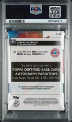 Immerse yourself in the world of sports card collecting with this extraordinary Jamal Musiala, Topps Finest card. A shining addition to any collection, this card is from the 2023 Autograph-Gold Refractor Insert Set, showcasing a golden hue that truly sets it apart.