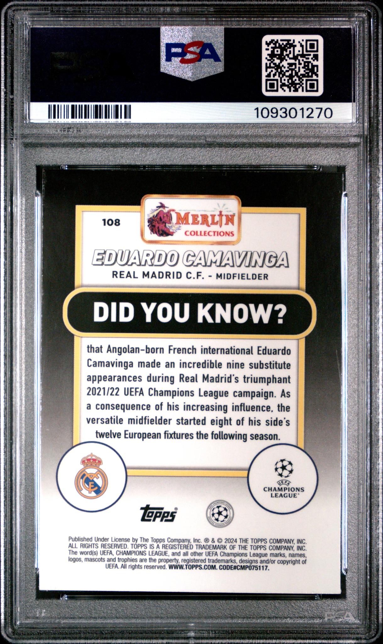 Key features that heighten the allure of this card include the prestigious association with Eduardo Camavinga, Real Madrid C.F., and Merlin UCC. It also boasts of being a Gold Refractor, PSA Mint 9, and is serial numbered 23/50, related to the UEFA Champions League.