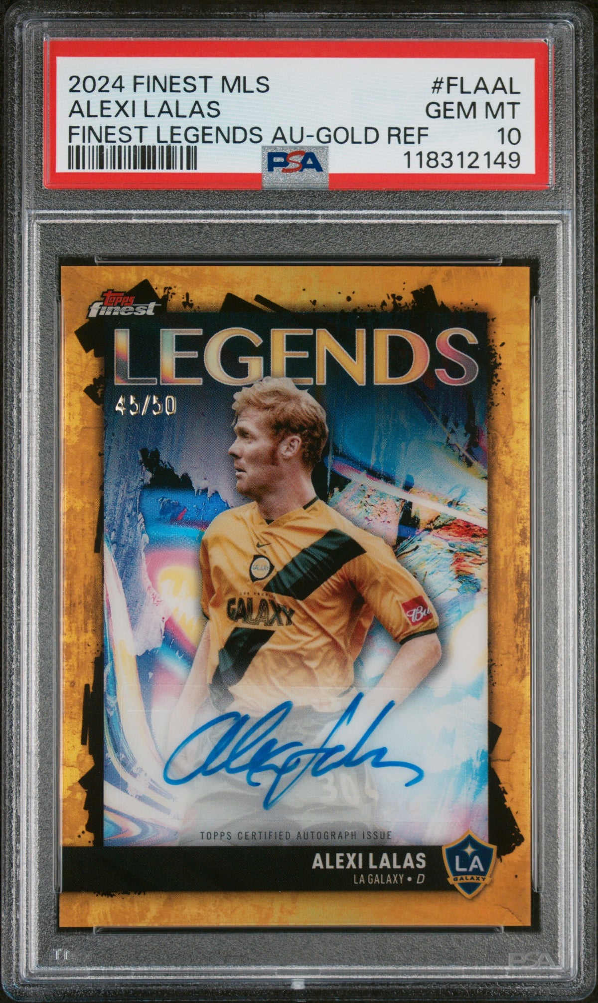 Please note that this card is part of the 'Soccer' category and it is not a rookie card. The key features of this card are its 2024 release, Topps Finest brand, Alexi Lalas signature, LA Galaxy affiliation, MLS league, Gold Parallel, Autograph, Gem Mint 10 grade by PSA, and its place in the Finest Legends set with a serial number of 45/50.