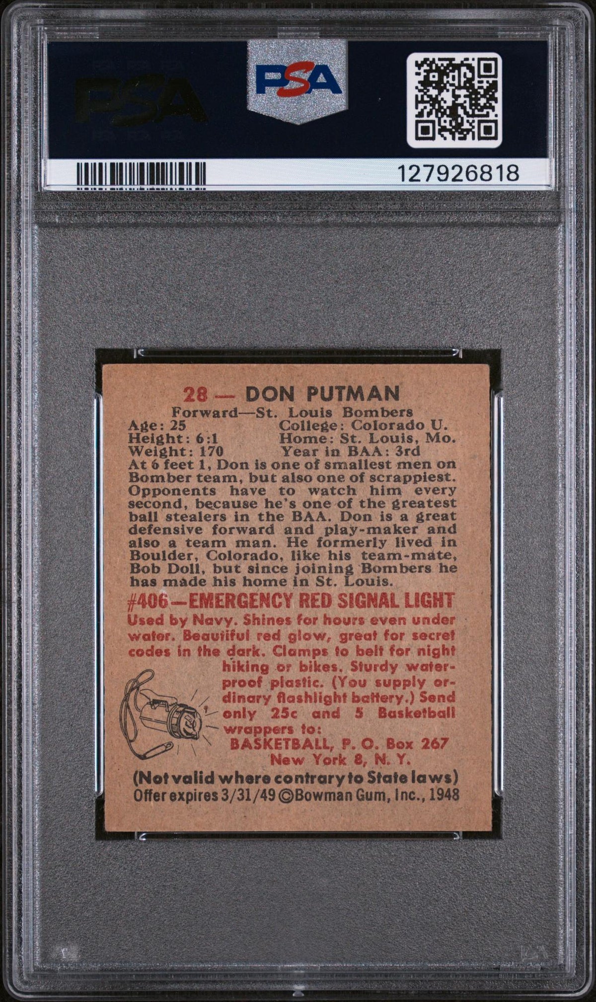 The card's charm is further enhanced by its 1948 release date, marking it as a relic from an iconic era in the BAA league. It's a tangible piece of the past that transports you back to the time when Don Putman was making waves in the basketball scene.