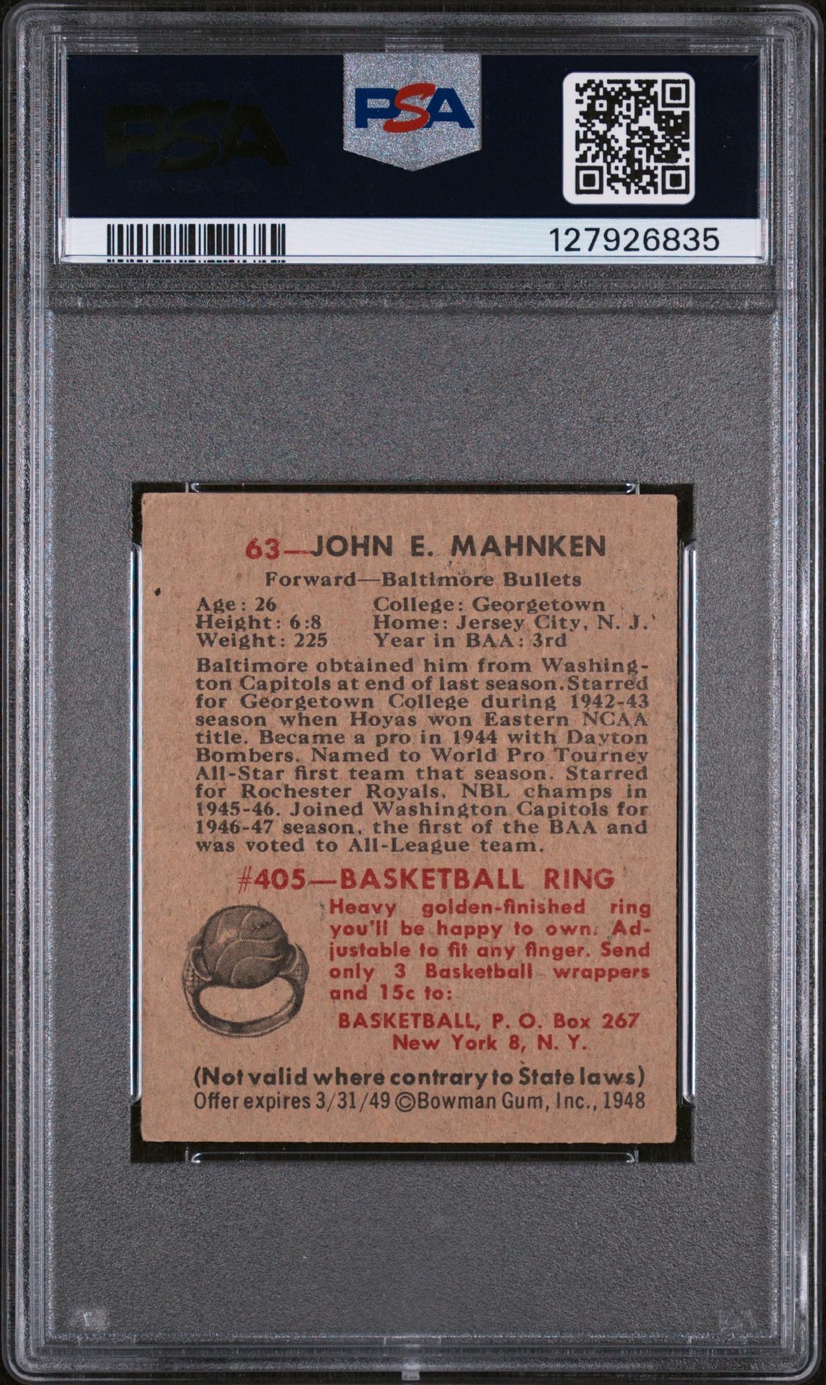 Step into the golden age of basketball with this magnificent 1948 Bowman #63 card featuring the legendary John E. Mahnken of the Baltimore Bullets. The Bowman brand is synonymous with high-quality and this card is no exception. Impeccably maintained, it has been professionally graded as EX 5 by the reputed PSA, a testament to its superior condition.