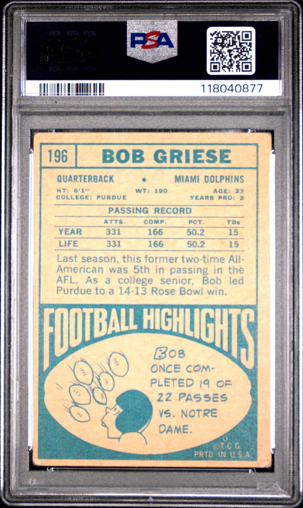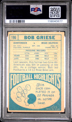 The 1968 Topps #196 Bob Griese Card belongs to the 1968 Topps Football card set - a popular set among collectors, adding another layer of desirability to this item. The key features of this card include its 1968 release, Topps brand, Miami Dolphins affiliation, AFL league name, and its status as a quarterback rookie card.