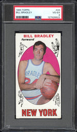Immerse yourself in the golden era of basketball with this extraordinary 1969 Topps #43 Bill Bradley card. This piece of history captures the essence of the New York Knicks legend and NBA Hall of Famer, Bill Bradley. A prominent figure in basketball history, Bradley's influence on the game is captured in this vintage treasure, effortlessly blending historical significance with collector's appeal. Manufactured by Topps, a brand synonymous with quality and a favorite among collectors, this card possesses charm and allure that transcends time. Its VG-EX 4 grading by the reputable PSA confirms its outstanding condition, despite being over five decades old. This is a testament to its enduring quality and the care taken to preserve its original state. The card is not a rookie card, but it commemorates Bradley's tenure with the Knicks, a period filled with memorable games and significant contributions to the team's success. It is also a tangible piece of the NBA's rich history, making it a must-have addition to any sports memorabilia collection. This card doesn't feature an autograph, serial number, or memorabilia, but its real charm lies in its pure, undisturbed form. It's a reflection of a bygone era, a snapshot of Bradley's career, and a piece of basketball's vibrant past. In summary, this 1969 Topps Bill Bradley card is a collector's gem. Its appeal lies not just in its vintage, but in the story it tells - a tale of basketball's past, of legendary games and the players who made them memorable. This card is more than just a collectible, it's a piece of history, a ticket to the past, and a testament to Bill Bradley's enduring legacy.