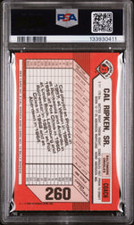 Step into the annals of baseball history with this exceptional Cal Ripken Sr. sports card from manufacturer Topps, under their esteemed Bowman brand. Dated to 1989, this card, number 260 in the set, belongs to the coveted Tiffany insert set, a parallel that magnifies its desirability among collectors. This card pays tribute to Ripken Sr.'s legacy with the Baltimore Orioles in the MLB, immortalising a name that is synonymous with baseball greatness. While the card is not autographed, its value lies in the memory of Ripken Sr.'s formidable presence on the field. What makes this card a standout addition to any collection is its professional grading. Evaluated by PSA, a reputable grading company, it has received a numeric grade of 9, indicating its mint condition. This card has been exceptionally preserved, retaining its glossy finish that adds a touch of sophistication and makes it a real eye-catcher. Part of the celebrated 1989 Bowman Tiffany set, this card showcases the iconic coach in all his glory. Its key features include its Tiffany parallel, PSA grading, mint condition, and the proud association with the Baltimore Orioles. This is not merely a sports card; it is a piece of baseball history, a tangible piece of the sport we all love. Whether you're a seasoned collector or a new fan, this Cal Ripken Sr. card is a must-have. Add this gem to your collection and own a piece of the legacy that Ripken Sr. left behind.