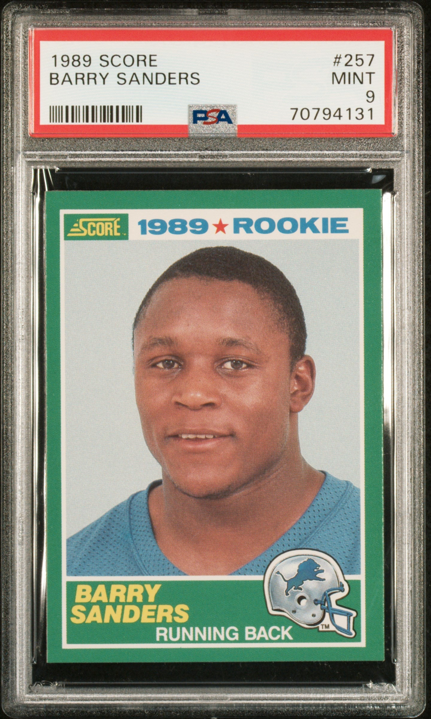 Dive into the enthralling world of sports card collection with this exquisite piece of sporting history - the 1989 Score #257 Barry Sanders Rookie Card. Manufactured by the renowned Score, this card features the legendary Detroit Lions running back, Barry Sanders. This card is not just an ordinary sports card, but it's a genuine rookie card that hails from the memorable 1989 Score set. The card pays tribute to Sanders' impressive debut in the NFL, making it an absolute must-have for any die-hard football fan or serious collector. The card stands as a testament to the player's awe-inspiring skills and the incredible legacy he has left in the world of football. What makes this card all the more appealing is its exceptional condition - professionally graded as 'Mint' with a numeric grade of '9' by PSA, one of the leading authorities in card grading. This high-grade rating assures you of the card's superb quality and pristine condition, promising a valuable addition to your collection. The card features a vibrant and detailed representation of Sanders in his Detroit Lions uniform, capturing the essence of his dynamic gameplay. As an integral part of the 1989 Score Rookie set, this card is a brilliant representation of Score's commitment to quality and detail. In conclusion, this Barry Sanders Rookie Card from 1989 Score is much more than just a sports card. It's a piece of sports history, a tribute to an NFL legend, and a valuable collector's item that stands the test of time. It's an opportunity to own a tangible piece of the past and a token of admiration for the game and its players. Add this gorgeous card to your collection today and let the legacy of Barry Sanders live on in your hands!