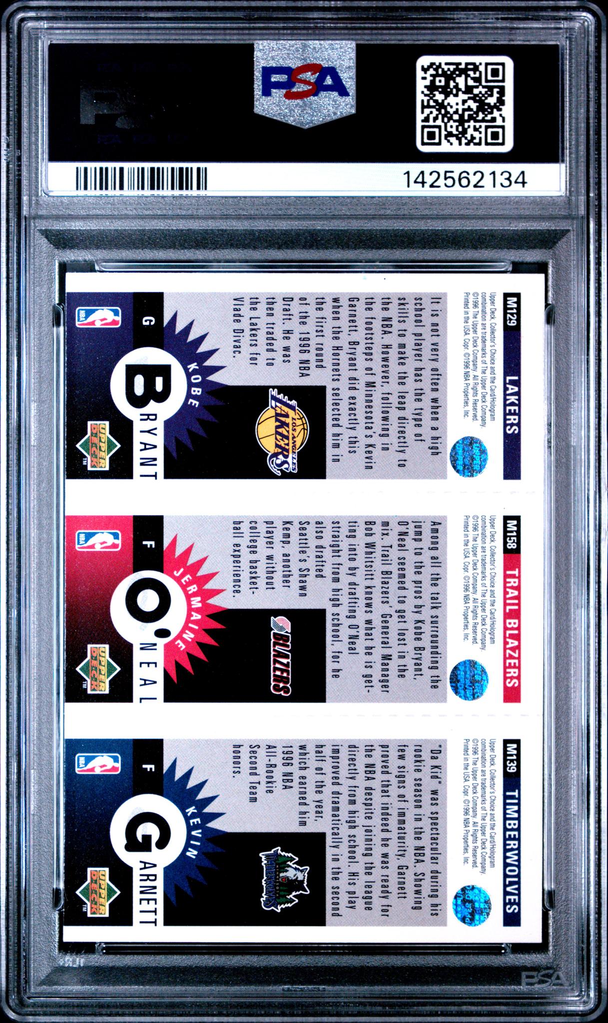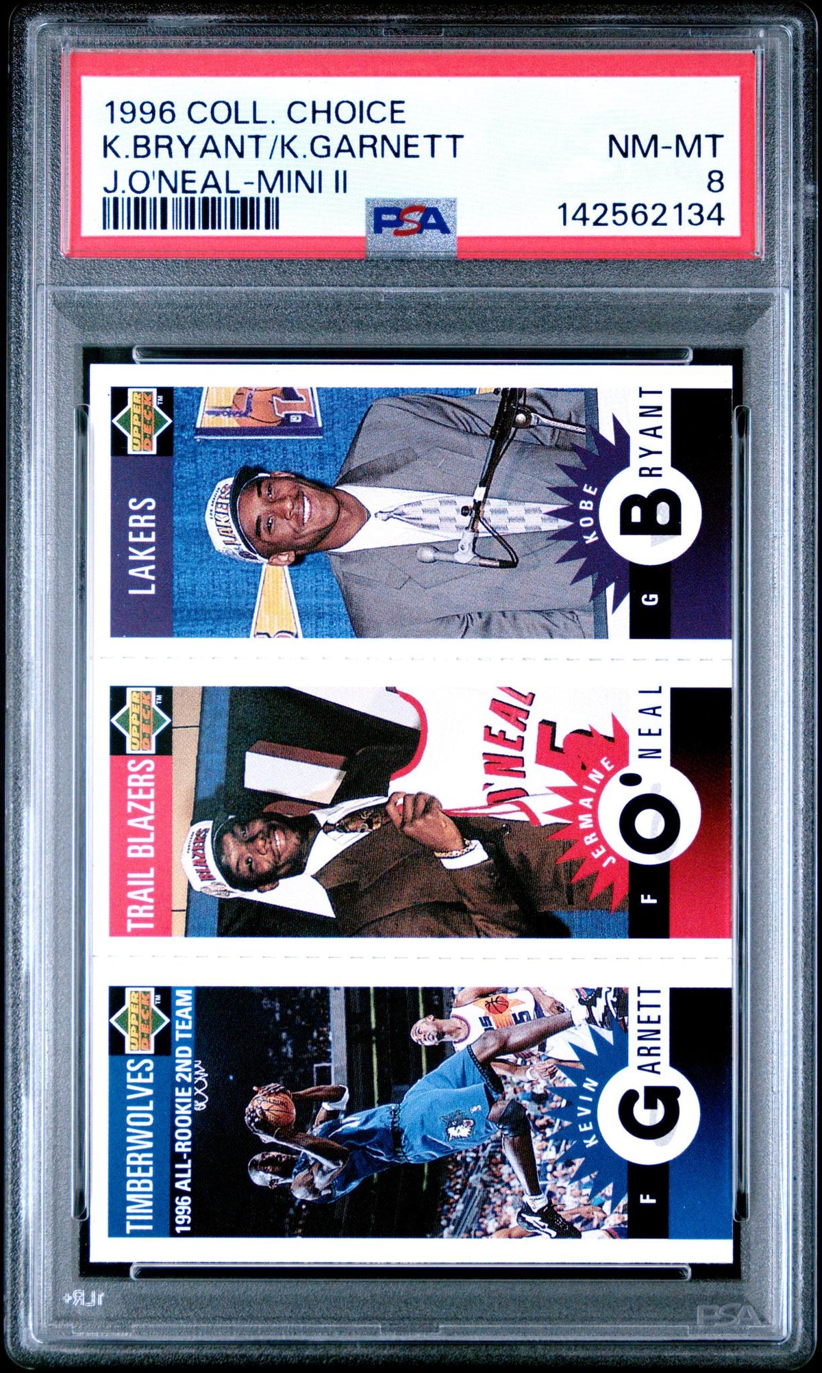Highlighting three of the NBA's most influential players, this 1996 Collector's Choice Mini II card featuring Kobe Bryant, Kevin Garnett, and Jermaine O'Neal is a must-have for any serious collector. As a rookie card from a time when these players were just beginning to make their mark on the league, its historical significance is undeniable. The Collector's Choice series is appreciated for its dynamic artwork and the Mini II insert set adds an additional layer of rarity and desirability. This card captures the early careers of these basketball legends, making it a treasured piece of NBA memorabilia.