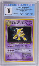 This card prominently features the commanding Dark Alakazam, a character that holds a special place in the hearts of fans across the globe. Holding a CGC grade of 8, this card is in near mint to mint condition, a testament to its excellent preservation over the years. The condition of this card is fantastic, making it a must-have for both seasoned collectors and those new to the world of Pokemon card collecting.