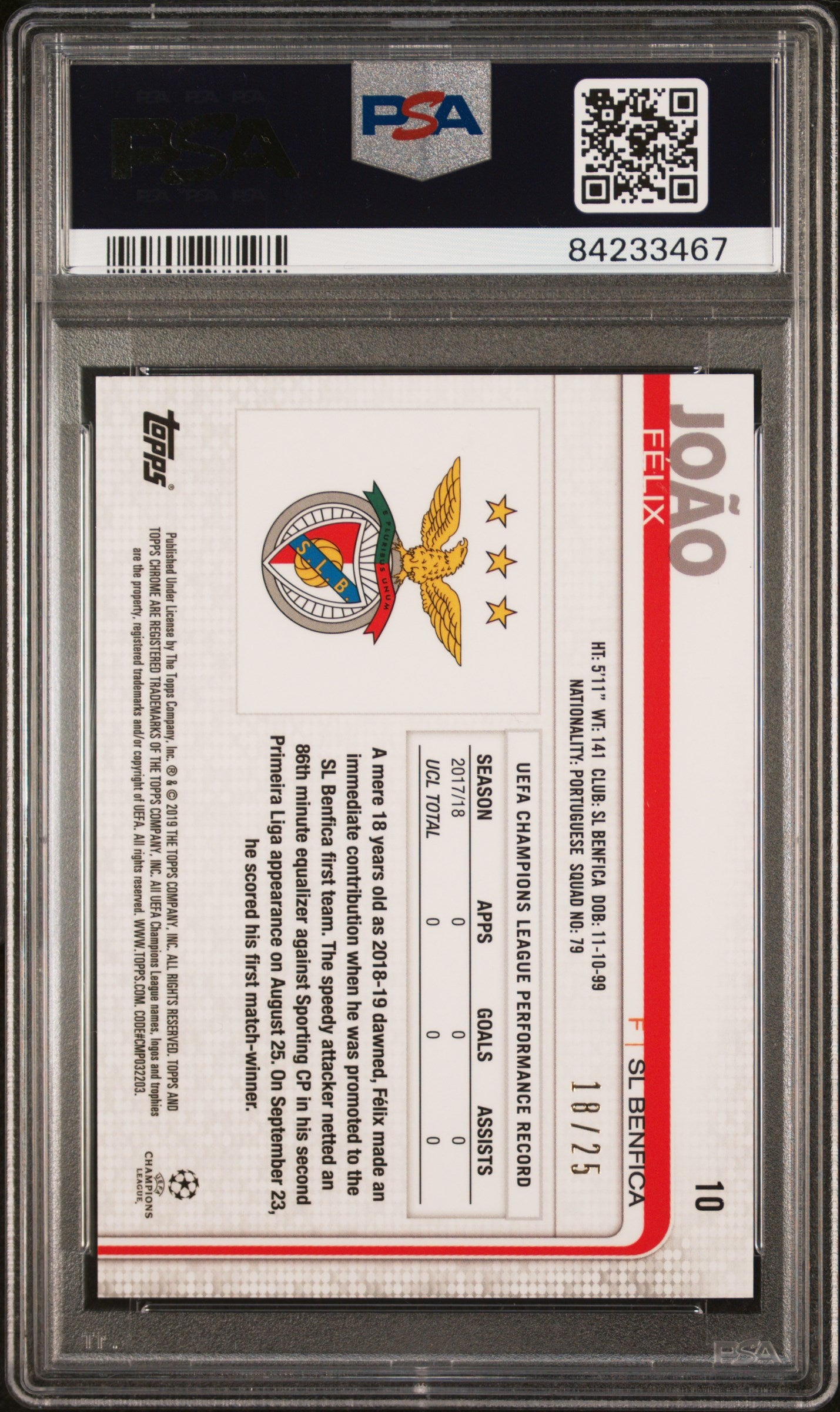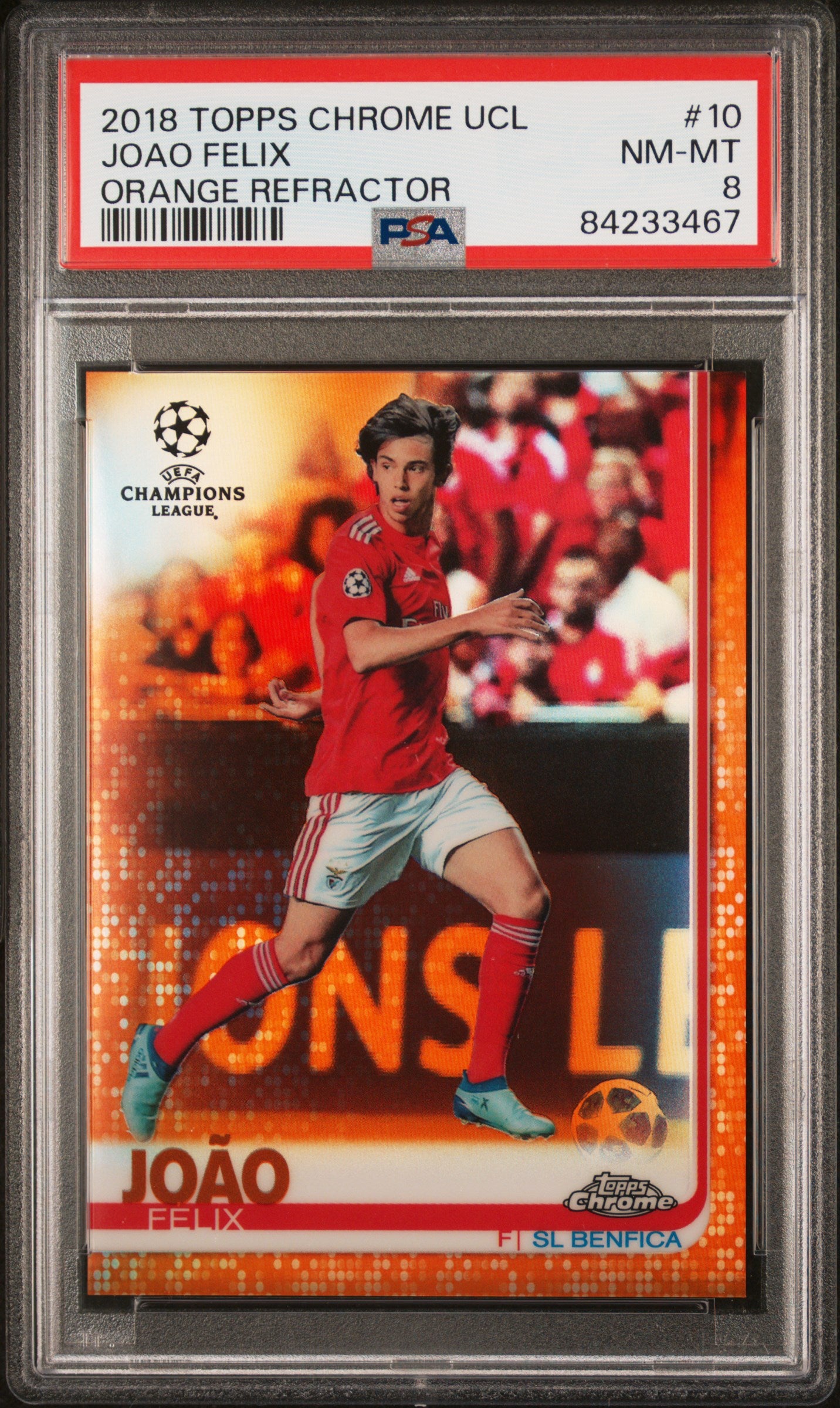 In conclusion, this 2018 Topps Chrome #10 Joao Felix Orange card is a treasured piece, perfect for fans of Joao Felix, SL Benfica, the UEFA Champions League, or simply for collectors who appreciate the value of limited-edition, professionally graded sports cards. Its orange refractor finish, its limited availability, and its professional grading by PSA make it a must-have item. Don't miss your chance to own this gem!