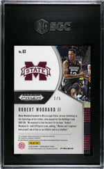 Immerse yourself in the world of basketball card collecting with this exceptional 2020 Panini Prizm Draft Picks card of Robert Woodard II. Manufactured by the esteemed Panini, this card is a part of the 'Prizm' brand and the coveted 'Black & Gold Prizm' insert set. This captivating card, bearing the card number '63', is a stunning tribute to Woodard's time at Mississippi State. The card is a true standout, boasting a Gem Mint '10' grading from SGC, one of the industry's trusted grading companies. The Gem Mint rating is a testament to the pristine condition of the card, ensuring it is a valuable addition to any collection. Notably, this card is a Black & Gold Prizm parallel, a unique feature that sets it apart from the crowd. It's not every day you come across a card that is serial numbered 1/5, making it a rare and sought-after piece. This card does not merely represent a player; it encapsulates Robert Woodard II's promising career and his relentless spirit. This is not just a card, but a tangible piece of basketball history that you can hold onto. Ideal for fans of Woodard, Mississippi State, or simply collectors of basketball cards, this card is a must-have in your collection. Don't miss out on the chance to own this extraordinary piece of sports memorabilia. It's more than just a card, it's a celebration of Robert Woodard II's journey, his talent, and his contribution to the game. Add this to your collection and let it be a constant reminder of the electrifying world of basketball.