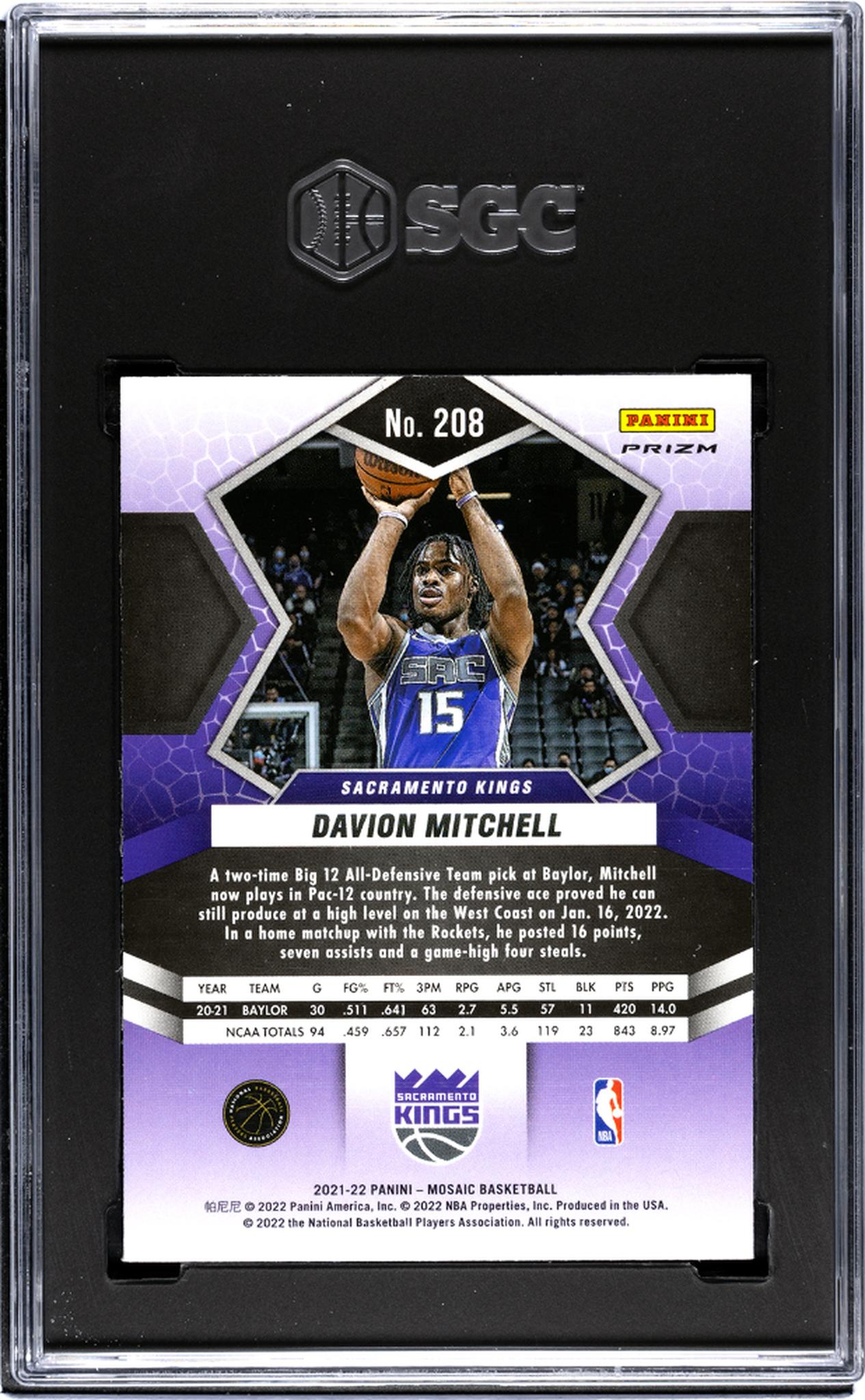 Behold an absolute gem of a sports card featuring the promising rookie Davion Mitchell, from the Sacramento Kings, in the 2021 Panini Mosaic collection! This card, #208 from the 75th Anniversary Prizm insert set, is a must-have for any serious collector.