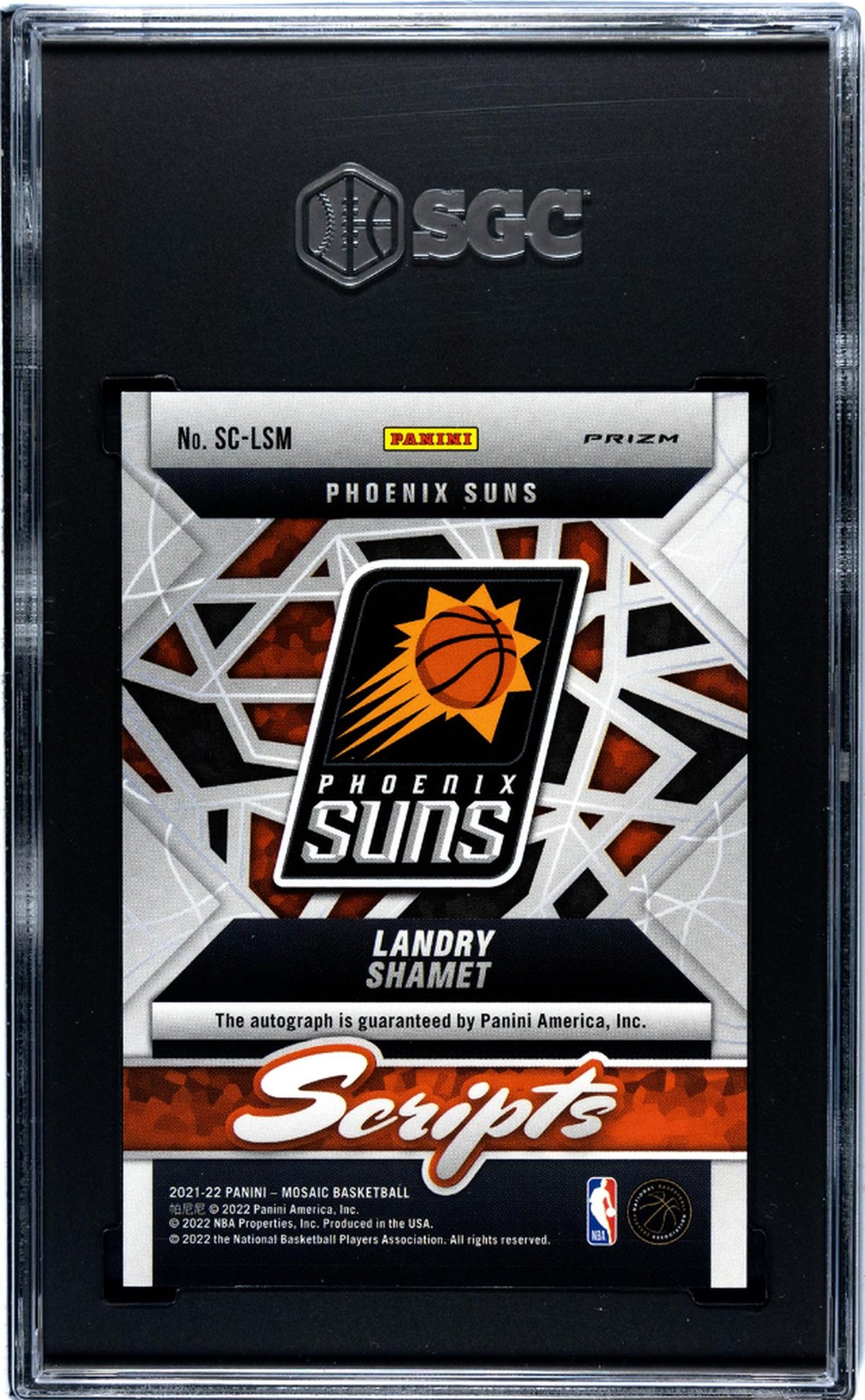 Immerse yourself in the world of basketball with this spectacular 2021 Panini Mosaic Scripts card featuring the exceptional talent of Landry Shamet from the Phoenix Suns. This card is not just a piece of paper, but a token of Shamet's skill and dedication on the court.