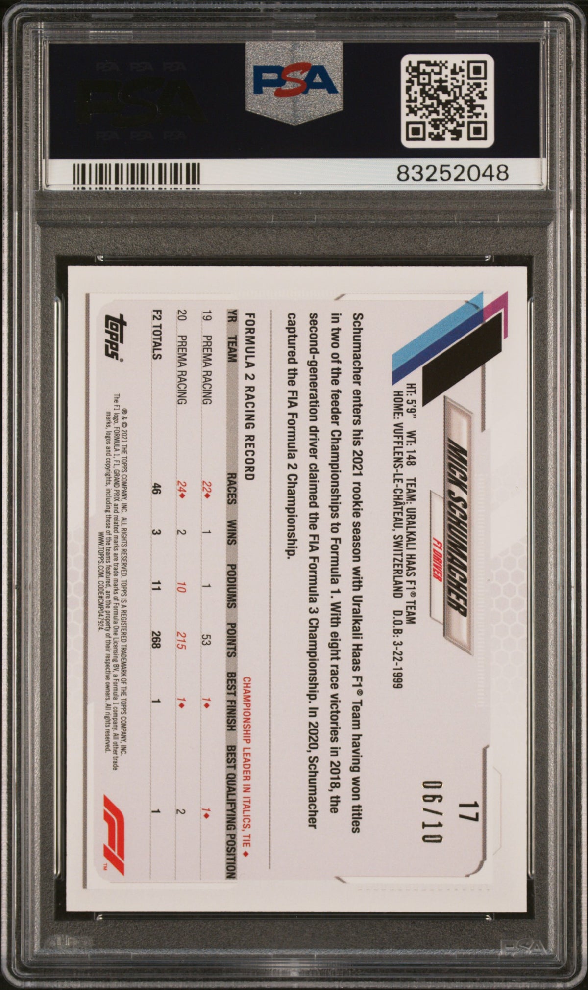 This card sets a new standard in sports card collection with its striking design and exceptional quality. Perfect for any Mick Schumacher fan, Formula 1 enthusiast, or sports card collector, this 2021 Topps Mick Schumacher Black card is a testament to a young talent's potential and an investment in the future of Formula 1. Secure this card to make your collection truly stand out!