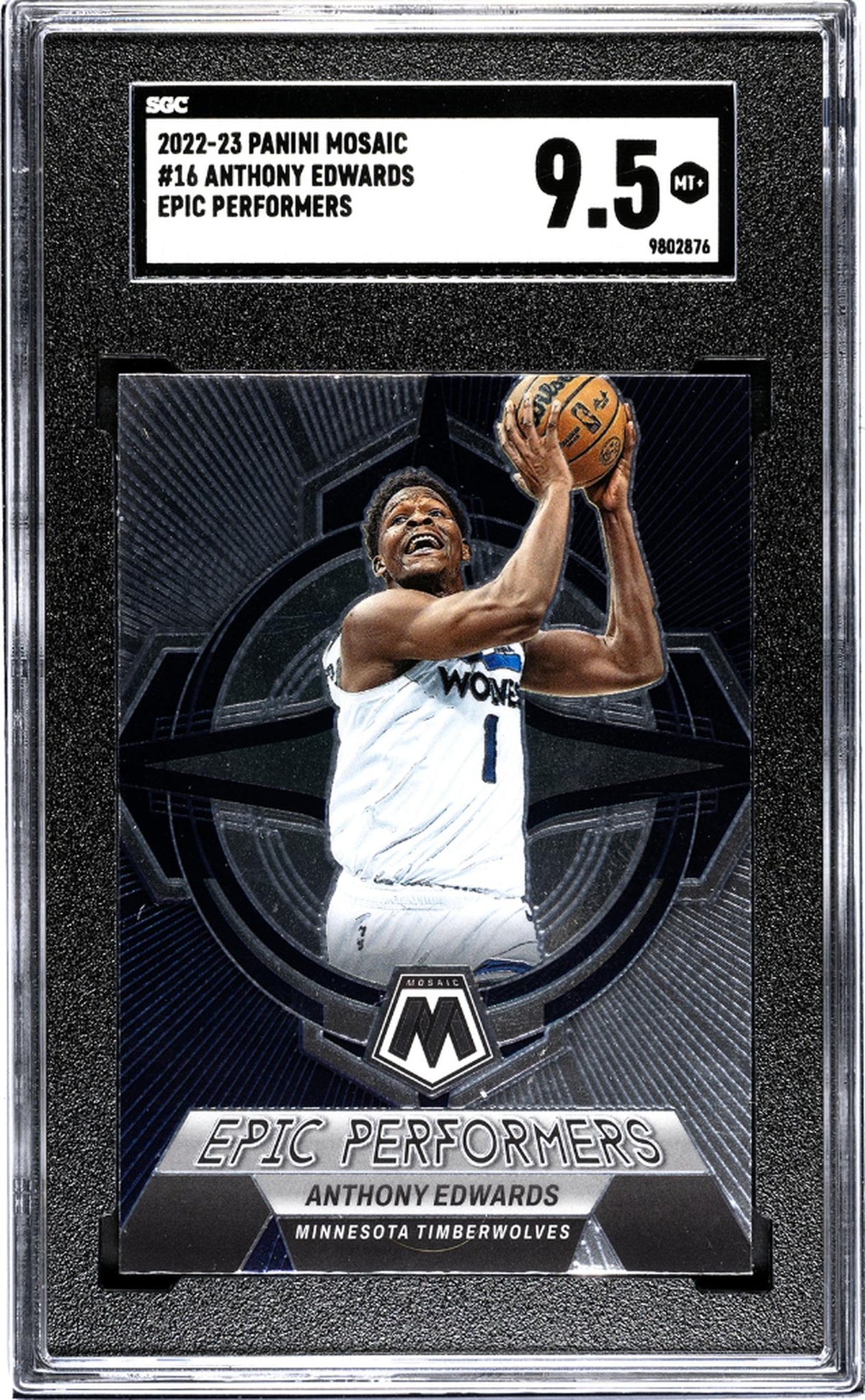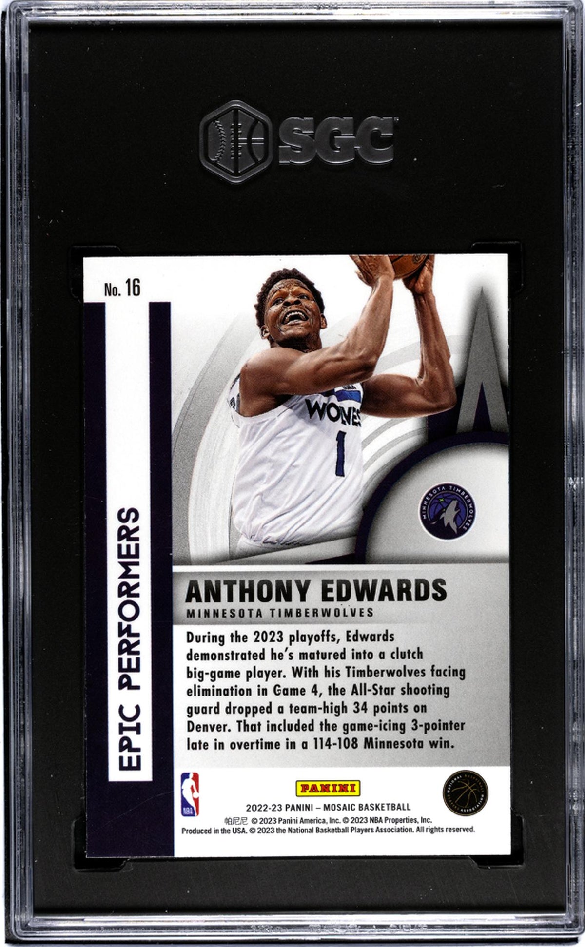 Step into the court with this spectacular 2022 Panini Mosaic Epic Performers card featuring the dynamic Anthony Edwards. This basketball card, a gem from the Panini Mosaic series, captures Edwards in his prime with the Minnesota Timberwolves, showcasing his impressive skills in the NBA league.