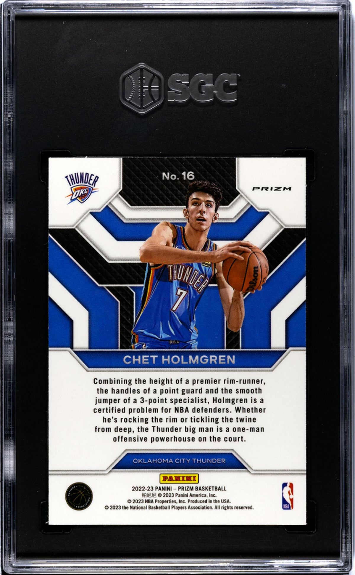 Step into the world of NBA with this stunning 2022 Prizm #16 Chet Holmgren card. Manufactured by the esteemed Panini and belonging to the Prizm brand, this card is part of the exclusive 'Emergent' insert set. What makes this card a truly remarkable collectible is that it's a rookie card of the magnificent Chet Holmgren, who currently plays for the Oklahoma City Thunder in the NBA. This card is a testament to Holmgren's promising career and an essential addition to any basketball card collection. The card is a Green Prizm parallel, adding a unique touch and making it even more desirable. The vibrant design and pristine condition of the card are sure to catch the eye of any collector. But the appeal of this card doesn't just stop at its visual appeal. It has been professionally graded by SGC, one of the most reputable grading companies, and has received the highest possible grade of 10 - Gem Mint. This guarantees the card's impeccable condition and its authenticity. Whether you're a seasoned collector, a fan of the Oklahoma City Thunder, or an admirer of Chet Holmgren, this card is a must-have. It symbolizes a moment in NBA history and represents the potential of a rising star in the basketball world. Don't miss the opportunity to own this piece of sports memorabilia. Own the game, own this card.