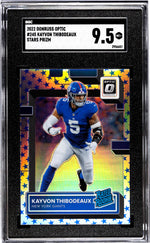 Feast your eyes on this stunning 2022 Panini Donruss Optic Stars Prizm card, featuring the dynamic rookie talent, Kayvon Thibodeaux of the New York Giants. This remarkable card, a part of the esteemed Donruss Optic Stars Prizm set, shines bright with its captivating Prizm finish, setting it apart from the rest.
