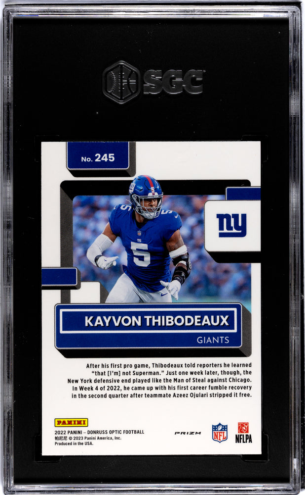Elevate your collection with this 2022 Optic #245 Kayvon Thibodeaux card and take pride in owning a piece of sports history. This card truly embodies the spirit of football and is a shining star in any sports card collection. Don't miss out on the opportunity to own this piece of the NFL legacy.