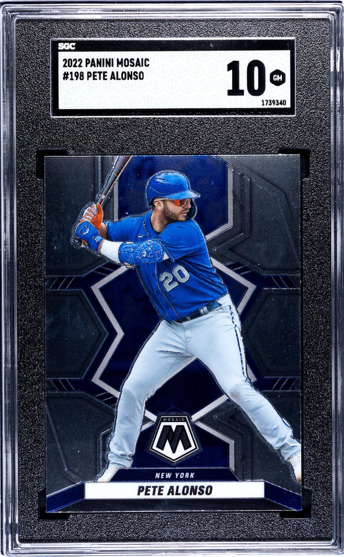 The 2022 Panini Mosaic Baseball set from which this card originates is known for its high-quality production and visually appealing designs. This Pete Alonso card is no exception, with a striking design that captures the player's intensity and passion for the game.