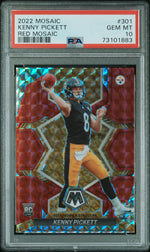 Elevate your sports cards collection with this stunning 2022 Mosaic #301 Kenny Pickett rookie card! Manufactured by the renowned Panini brand, this gem is a must-have addition to any serious collector's portfolio. This card features the talented Kenny Pickett, a dynamic player making waves in the NFL with the Pittsburgh Steelers. The card is part of the 2022 Mosaic Football set, known for its quality and attention to detail. Pickett's athletic prowess and potential are beautifully captured in the card's striking design, making it a conversation starter in any collection. What sets this card apart is the vibrant Red Mosaic parallel, a feature that enhances its visual appeal and collectability. It's a beautiful piece of sports memorabilia that truly stands out, making it a fantastic gift for any football enthusiast or a treat for yourself. Further adding to this card's value is the professional grading by PSA, the authority in sports cards grading. With a perfect Gem Mint 10 score, you can be assured of the card's impeccable condition, affirming its high quality and long-lasting value. This is not just a card; it's a piece of NFL history featuring a promising star of the Pittsburgh Steelers. The 2022 release, Kenny Pickett rookie card with its Red Mosaic parallel, encapsulates a moment in time from a thrilling season. This collectible football card is more than just a piece of cardboard - it's a tangible piece of the sport we all love. Don't miss out on the opportunity to own a part of the NFL legacy with this exceptional 2022 Mosaic #301 Kenny Pickett rookie card. Whether you're a die-hard Steelers fan, a Kenny Pickett supporter, or a collector of NFL memorabilia, this card is a fantastic addition to any collection. Grab it today and let this gem be the centerpiece of your sports cards collection!