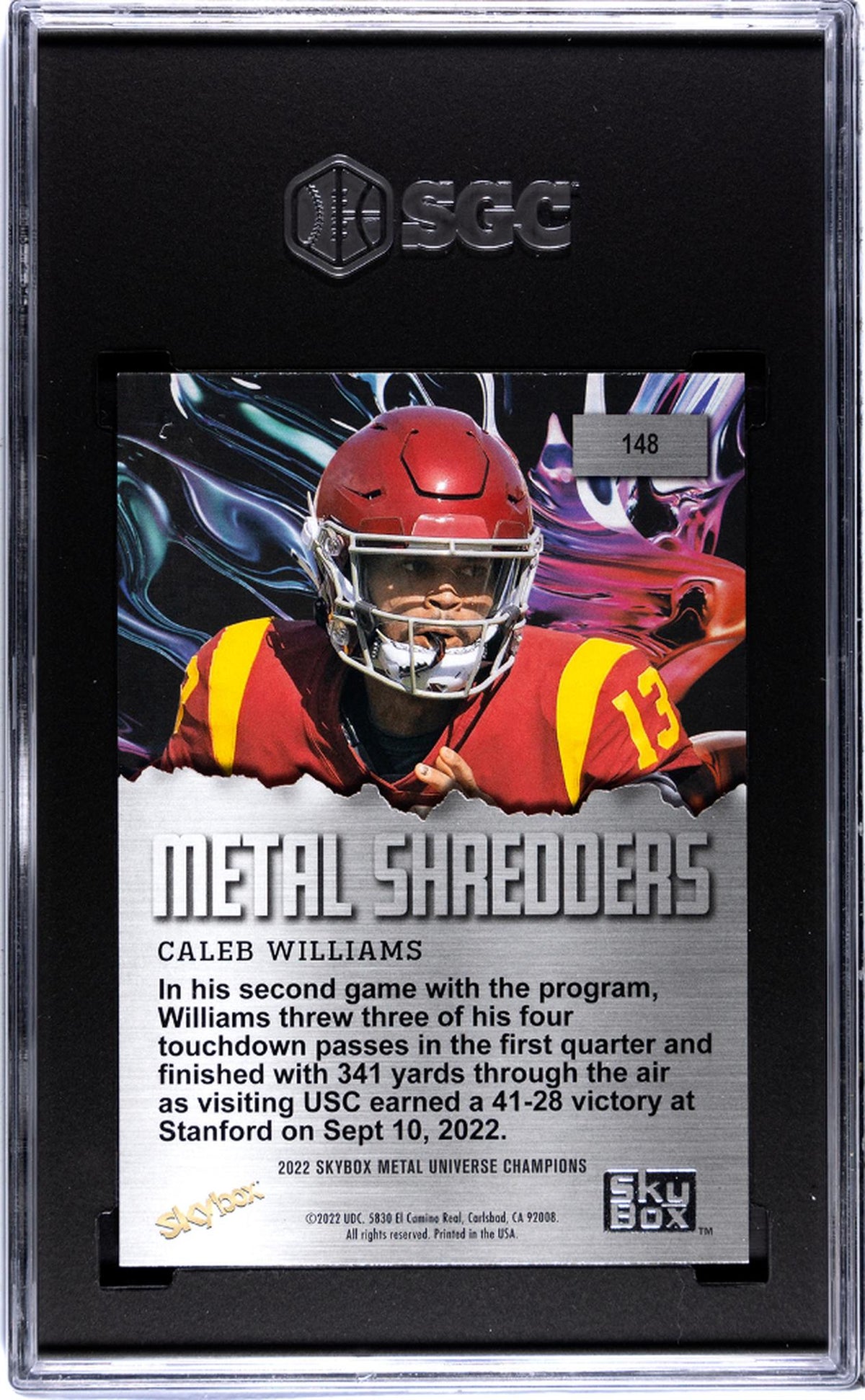 In summary, this 2022 Skybox #148 Caleb Williams rookie card from the Metal Shredders set is a fantastic addition to any sports card collection. Its impeccable condition, professional grading, and the promising player it showcases make it a must-have for any devoted fan or collector. This card epitomizes the thrill and excitement of football, ensuring it will be cherished by its owner for years to come.