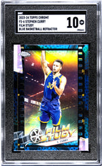 Immerse yourself in the world of basketball with this stunning 2023-24 Topps Chrome FS-6 Stephen Curry card from the Film Study Blue Refractor set. Manufactured by Topps, a trusted name in sports collectibles, this card is a testament to quality and attention to detail.