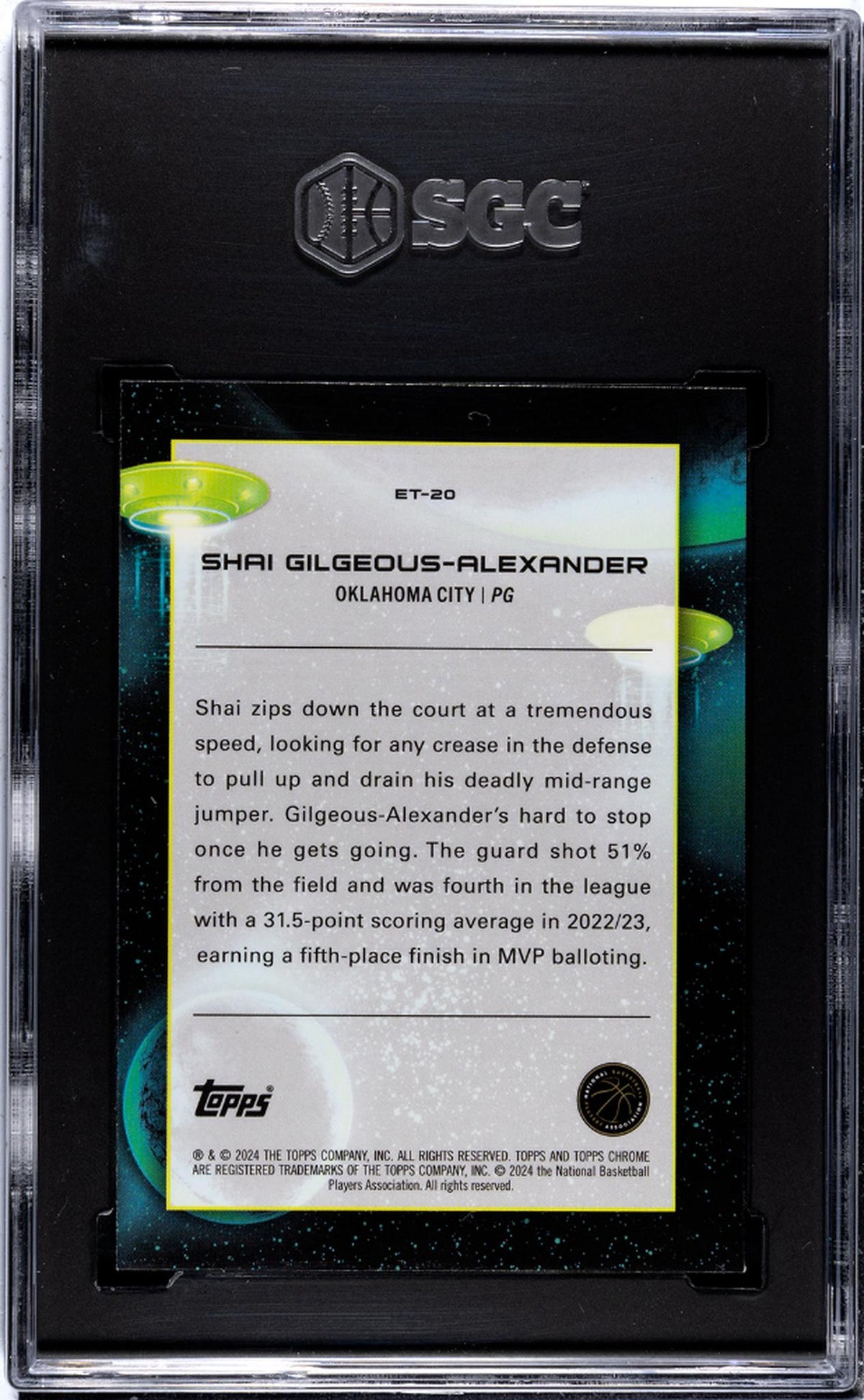 A professional grade of 9 by SGC confirms the mint condition of this card, making it a fantastic addition to any sports card collection. The Extraterrestrial Talent insert set is a testament to the extraordinary talent that Shai Gilgeous-Alexander brings to the NBA, and this card encapsulates that perfectly.