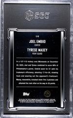The card features the legendary Joel Embiid alongside the rising star, Tyrese Maxey, an enticing combination for any basketball enthusiast. The dynamic duo's synergy is palpable, making this card a must-have for your collection. This card beautifully encapsulates the essence of the game and the indomitable spirit of these athletes.