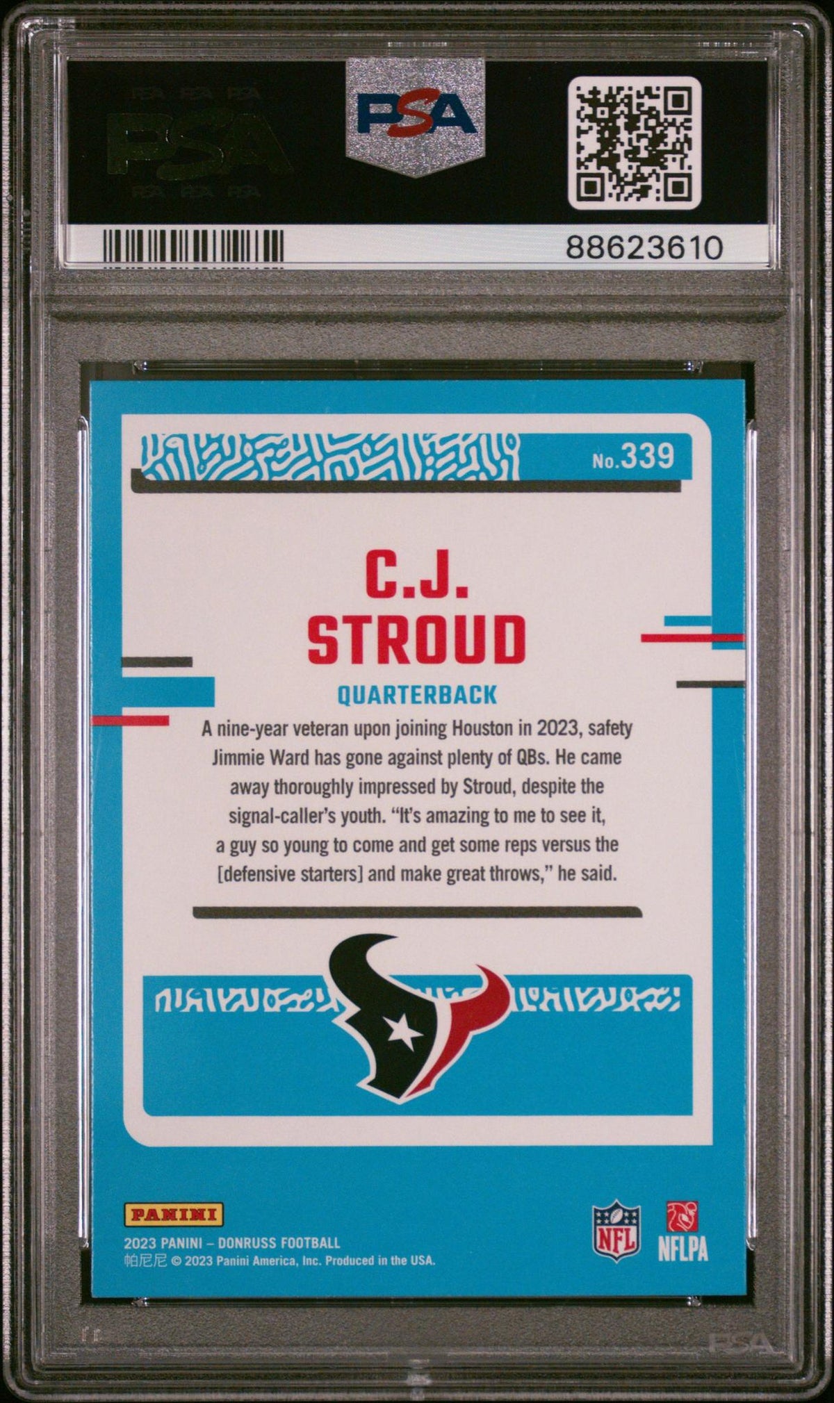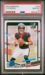 : The 2023 Donruss #339 CJ Stroud card is a must-have for any serious football card collector. As a rookie card of CJ Stroud, the promising quarterback for the Texans, this card represents a pivotal moment in this rising star's career. Stroud's popularity and potential make this card a desirable asset for those looking to invest in promising players early in their careers. This card, coming from the iconic Donruss set, carries an allure that is appreciated by both long-time collectors and hobby newcomers alike. The PSA 10 grade further underscores the card's appeal and potential for long-term value.