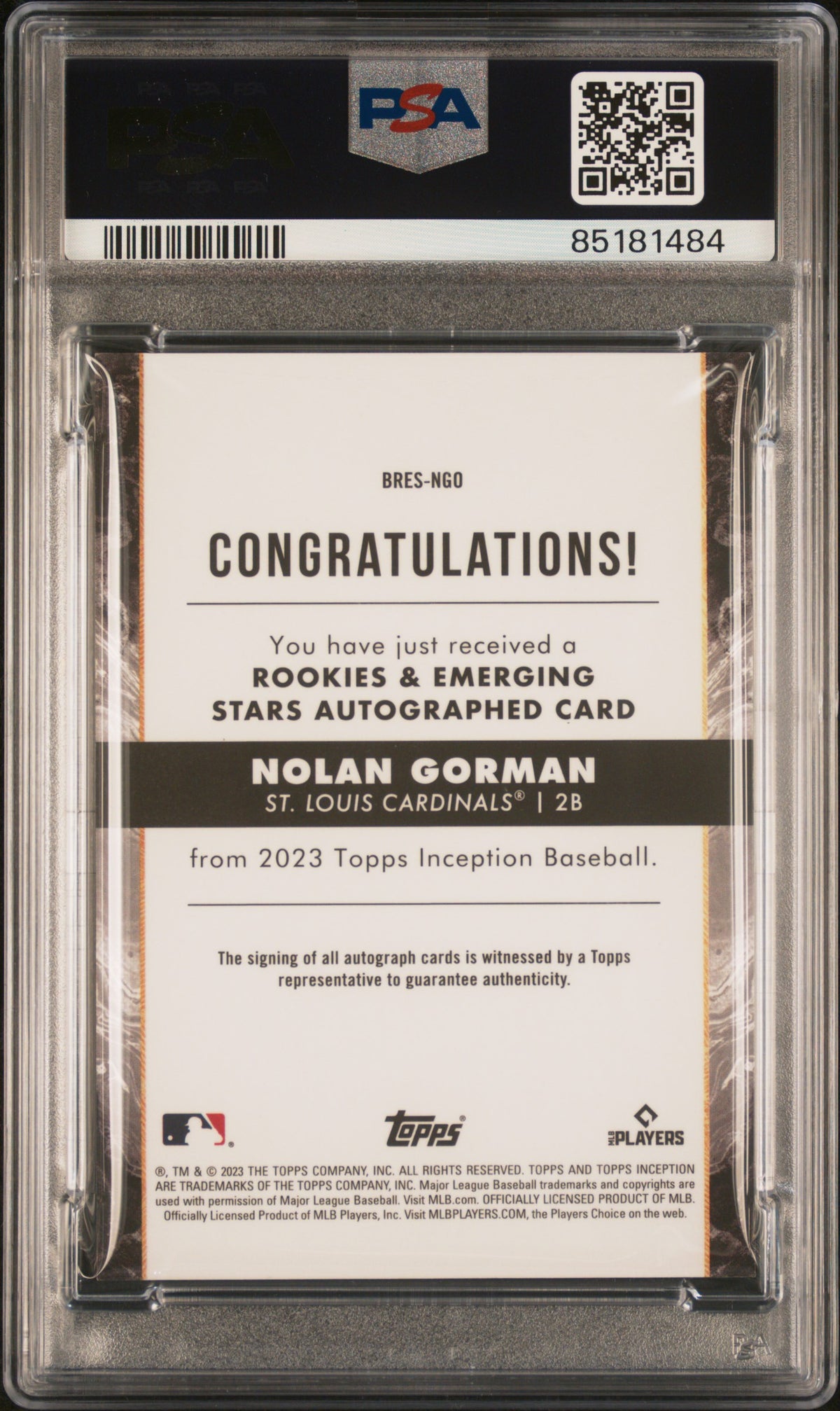 The 2023 Inception BRESNGO Gorman Auto is a standout piece from the Topps Inception set, known for its striking visuals and a testament to the promising career of this young player.